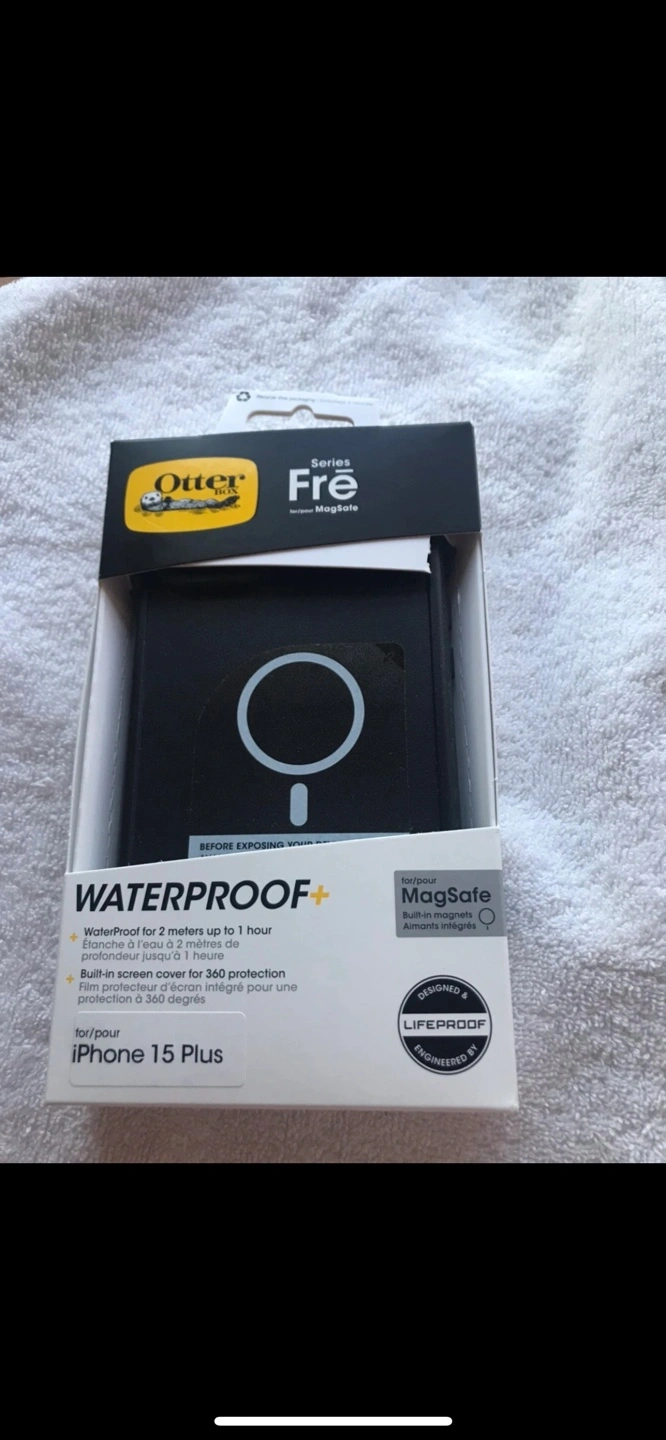 Amazing Otterbox Fre waterproof black case, MagSafe and protects all sides of the phone.