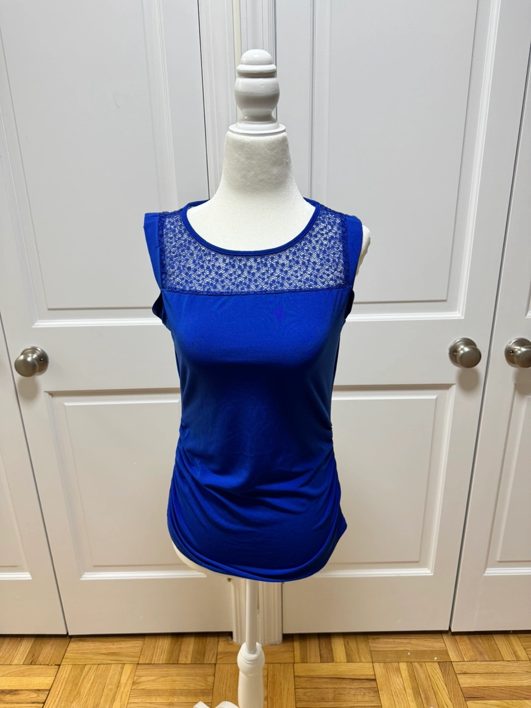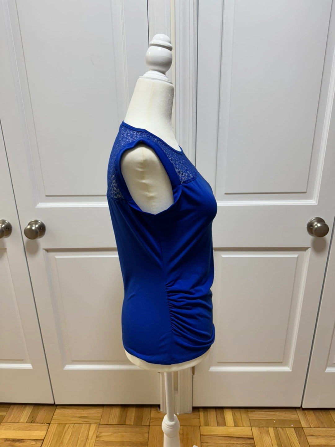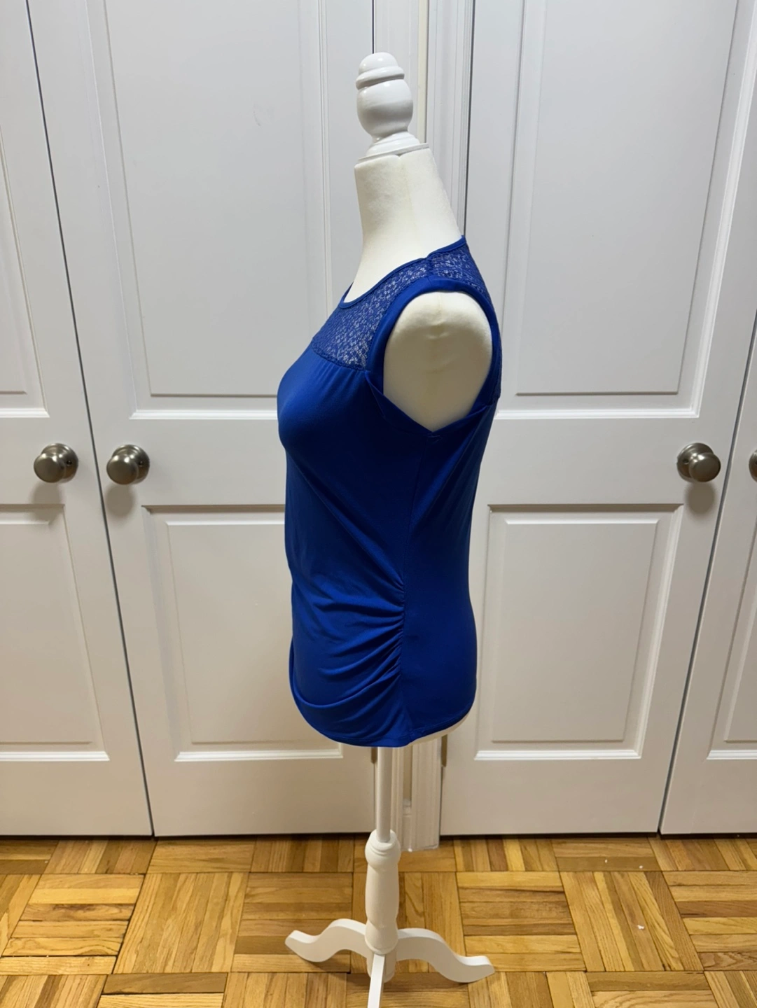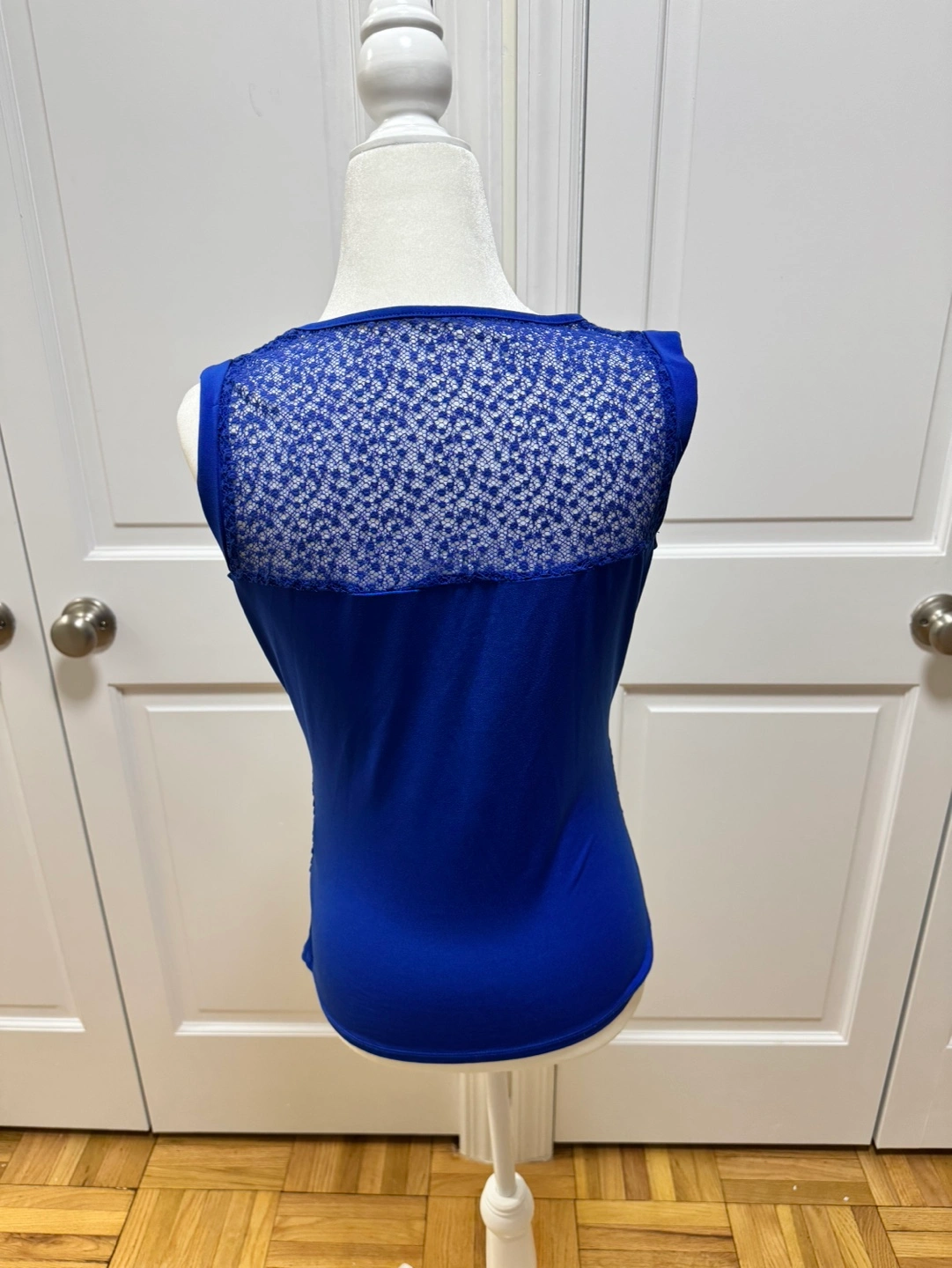Royal blue sleeveless top. Features a lace insert at the neckline. Fitted silhouette. Stretchy material.