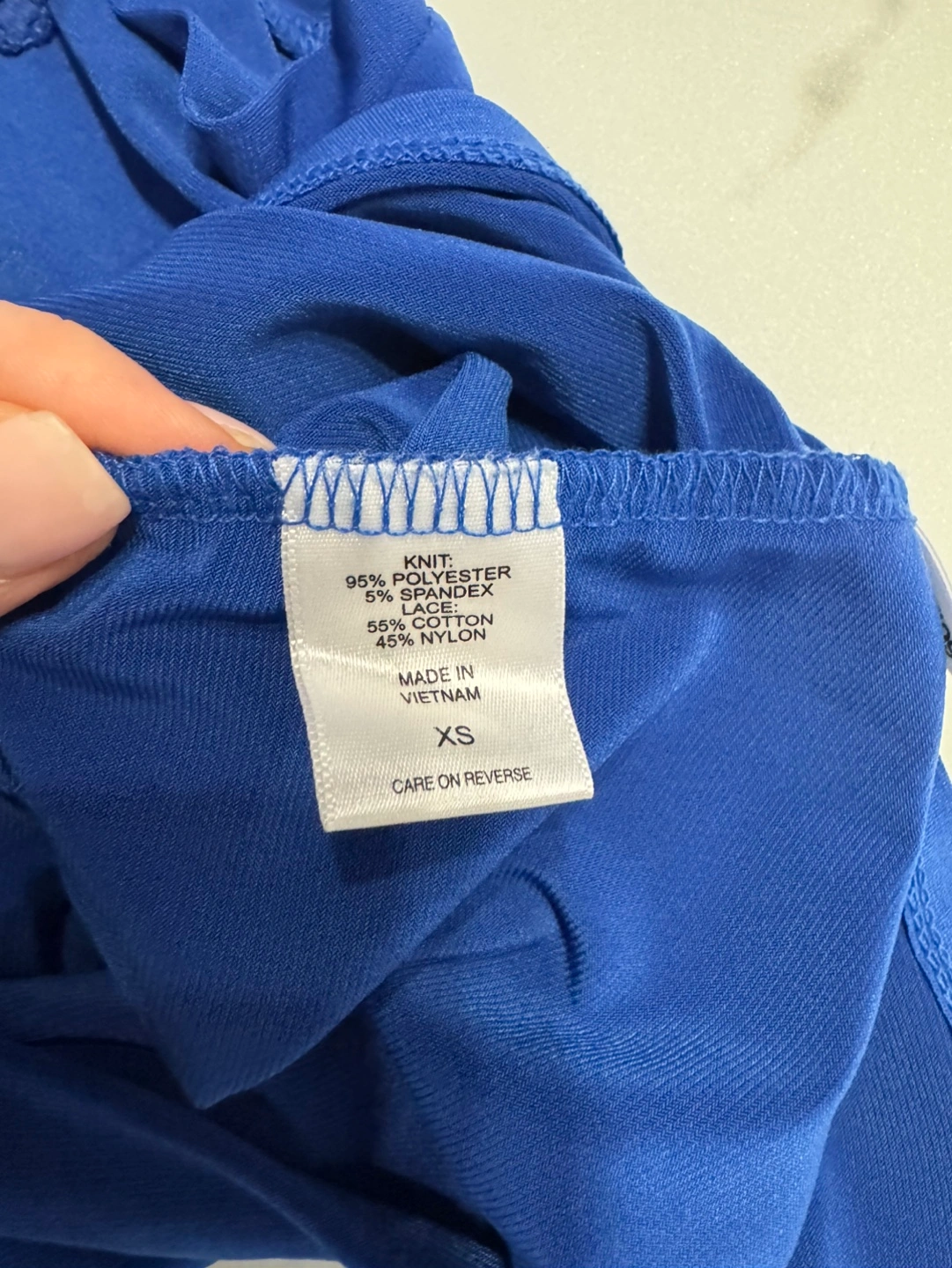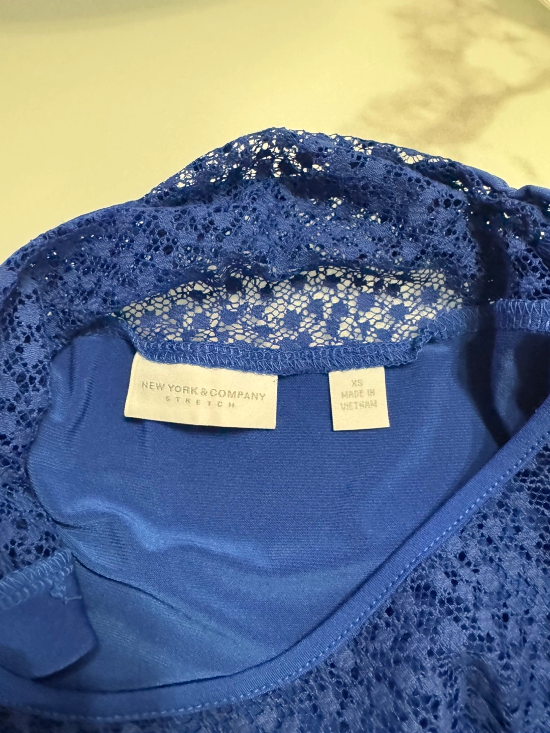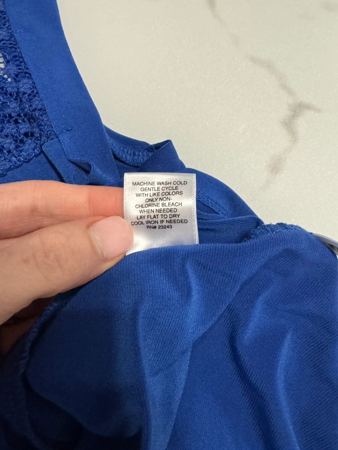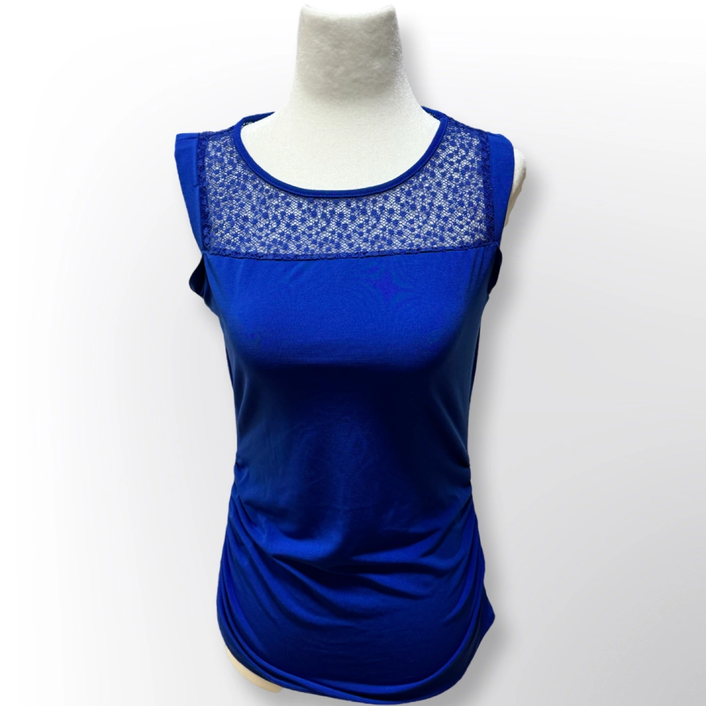 Royal blue sleeveless top. Features a lace insert at the neckline. Fitted silhouette. Stretchy material.