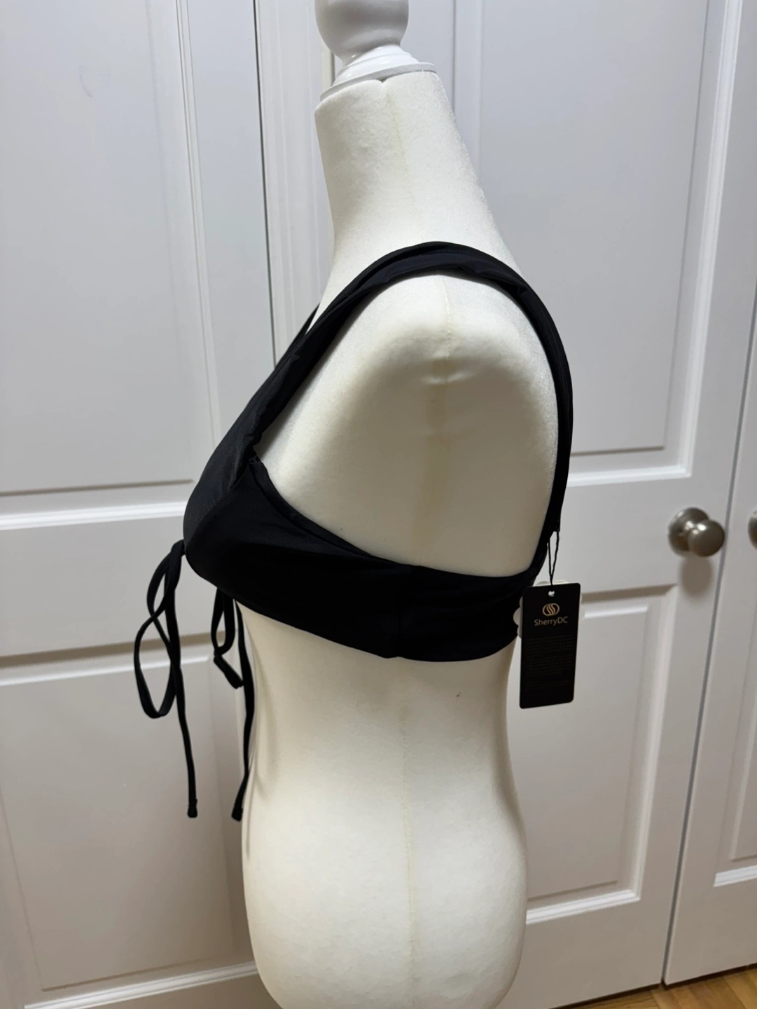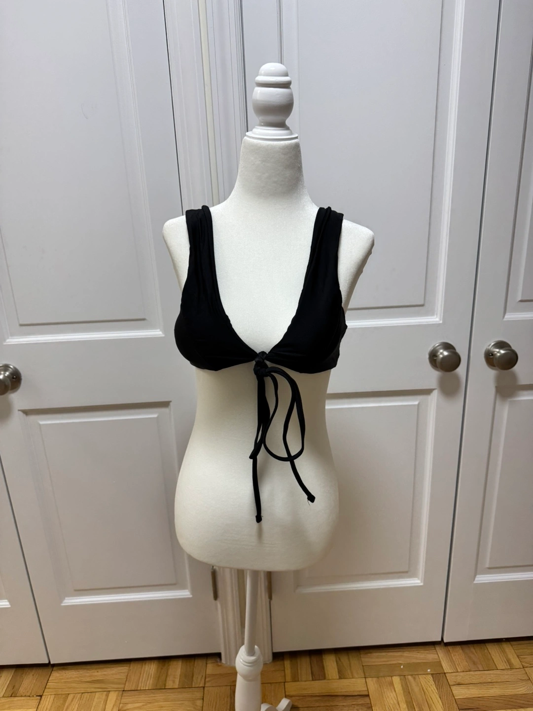 New with tags, never worn black bikini top. Features a tie-front design and adjustable straps. Great for summer!
