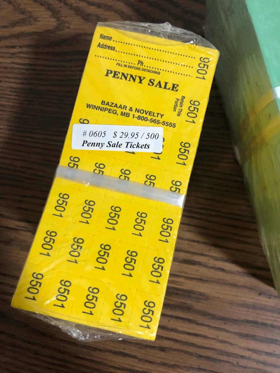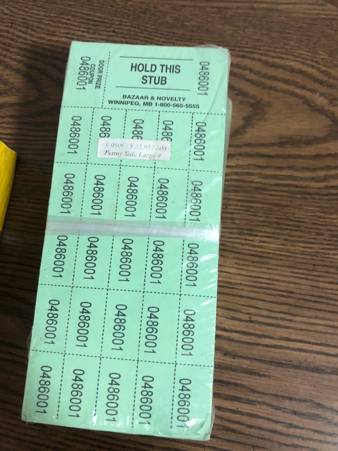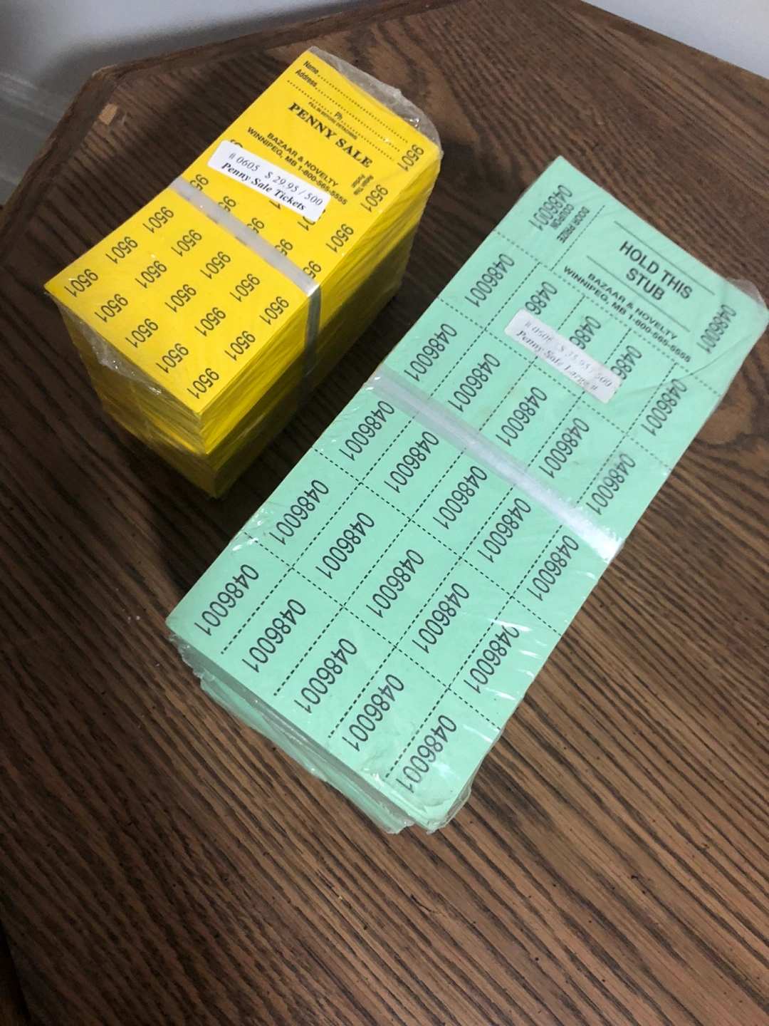Two bundles of unused penny sale tickets. Yellow and green tickets. Tickets from Bazaar & Novelty, Winnipeg, MB.
