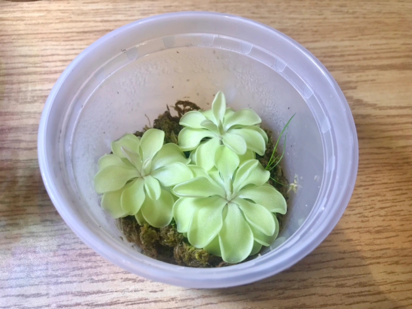 3 plants in a small takeout container, each plant is around 4 cm in diameter.