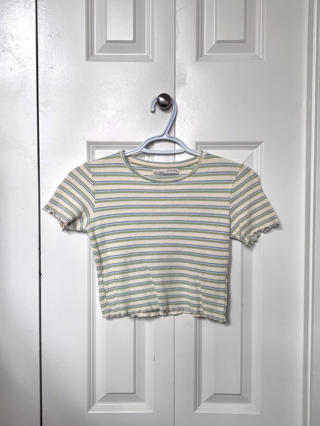 - yellow, green and blue striped crop top size S (discontinued) - ribbed material & scalloped edges - only worn once or twice cash only!
