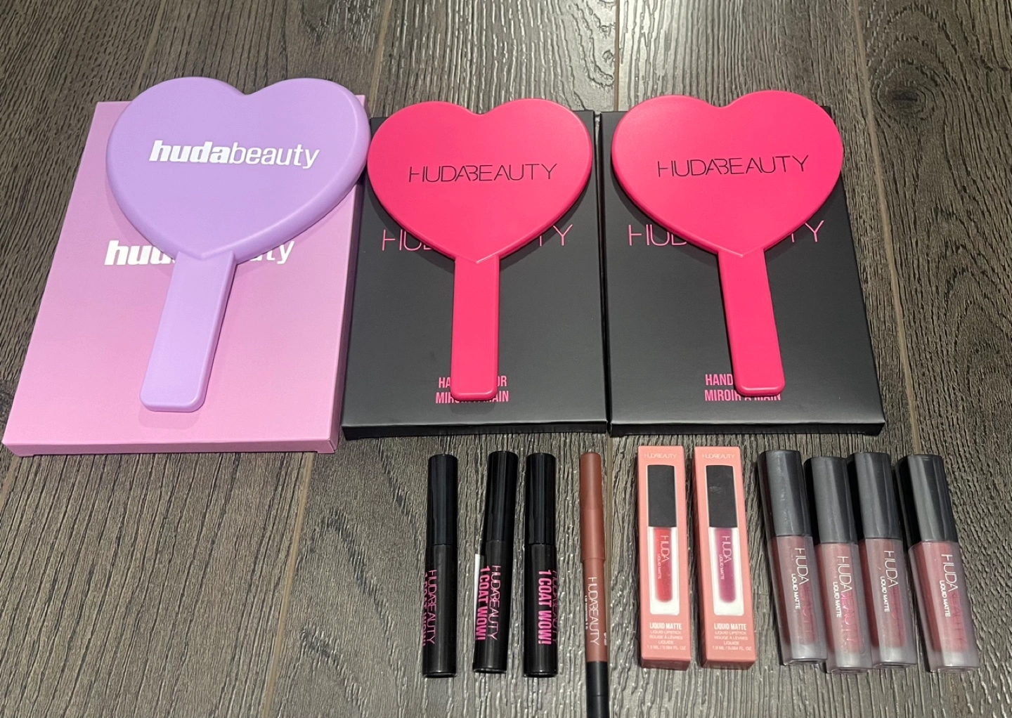 three mascaras, one lip liner, and five liquid matte lipsticks. All Huda Beauty brand.