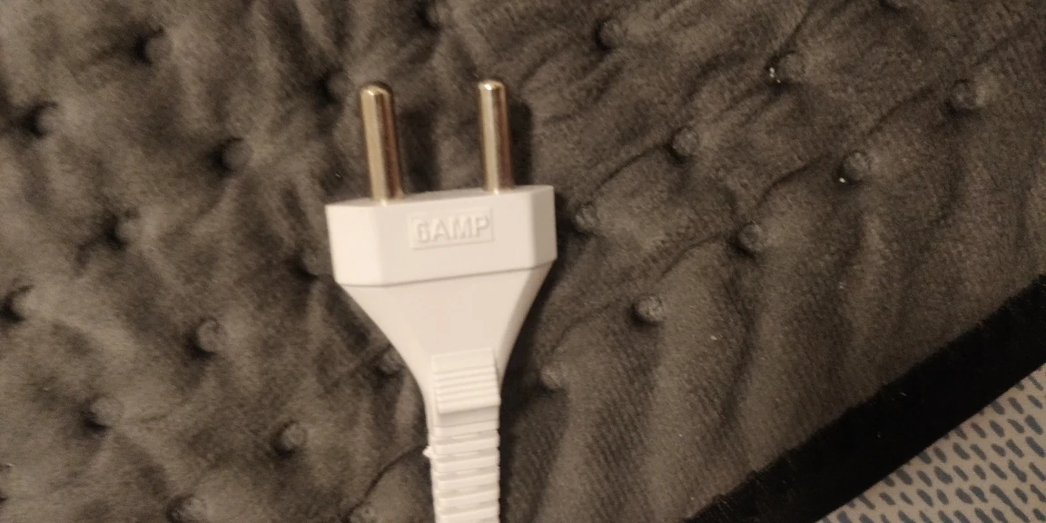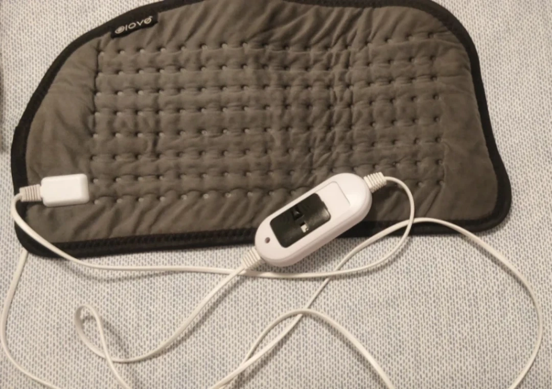 Grey electric heating pad. Features an adjustable strap and three heat settings. Includes power cord and controller. Good condition.