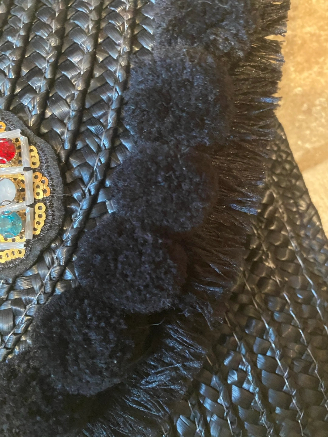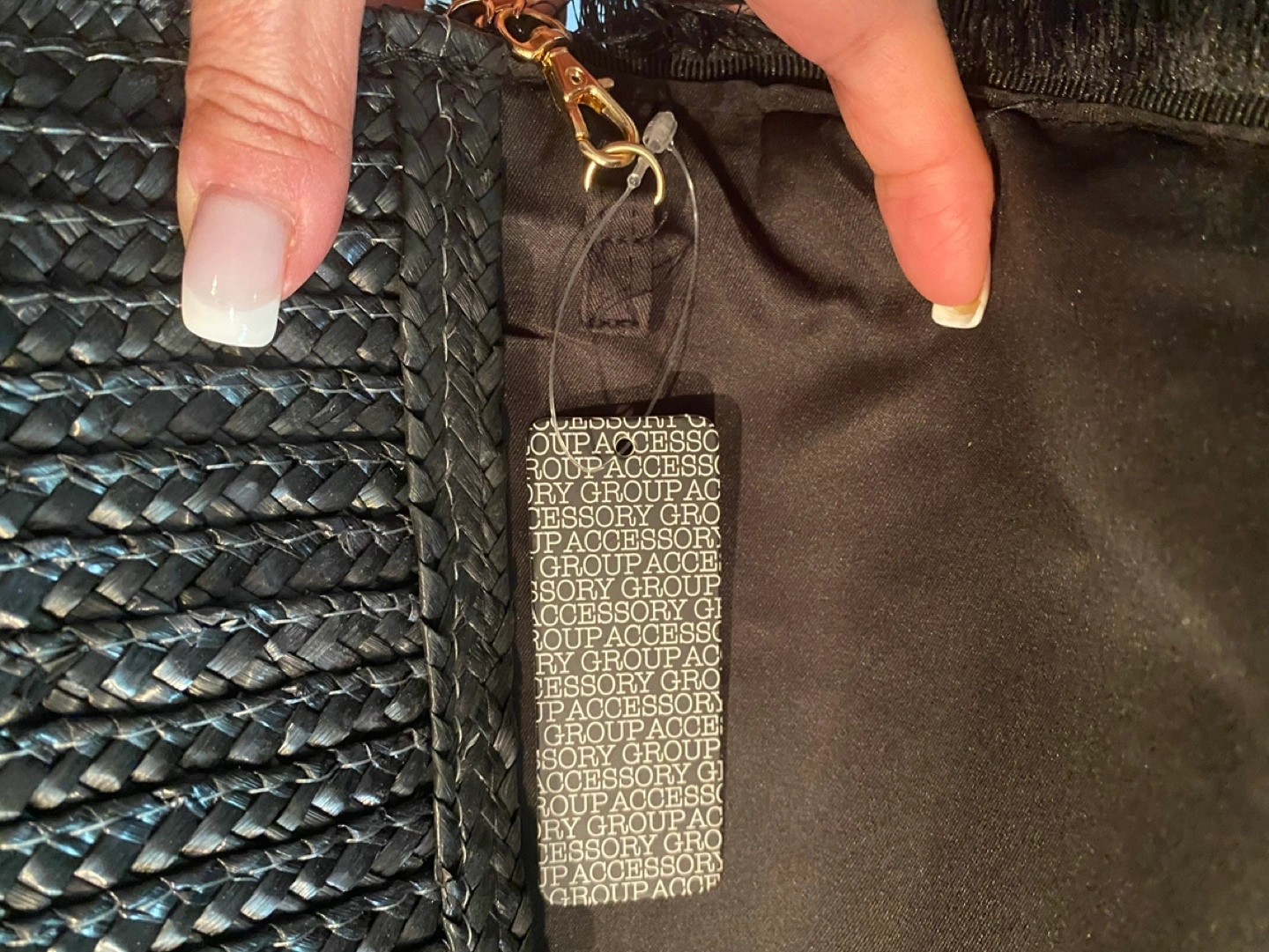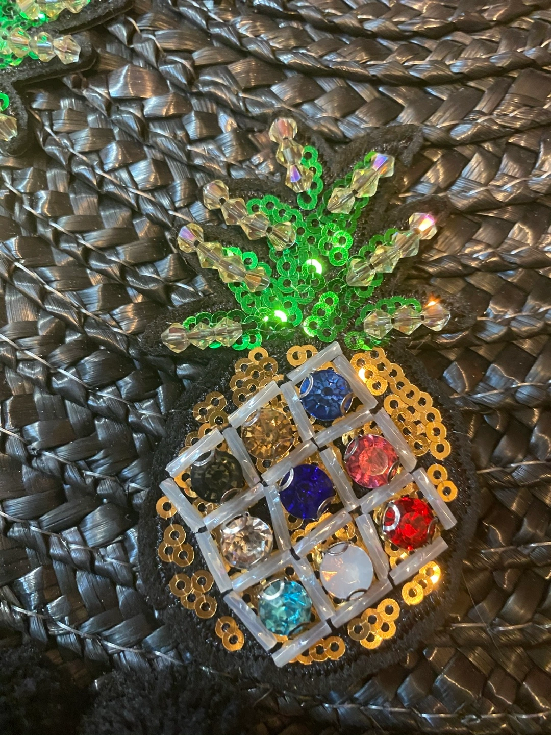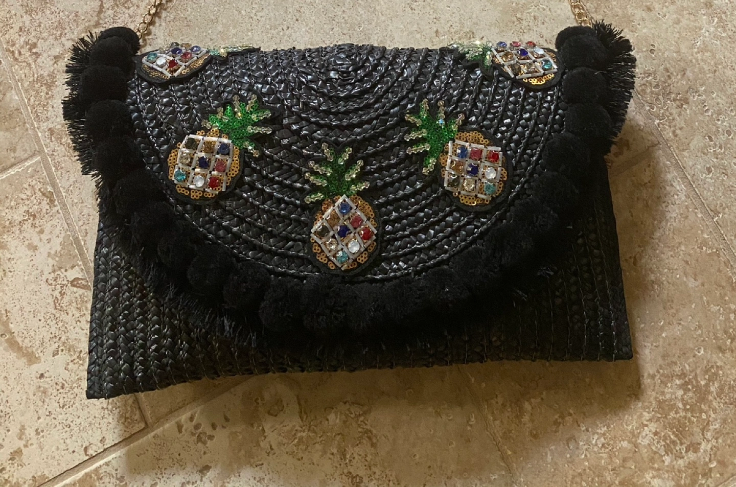 Beautiful black woven clutch. Features pineapple accents. Black pom-pom trim. Gold chain detachable strap. Perfect for summer. Brand new with tags.