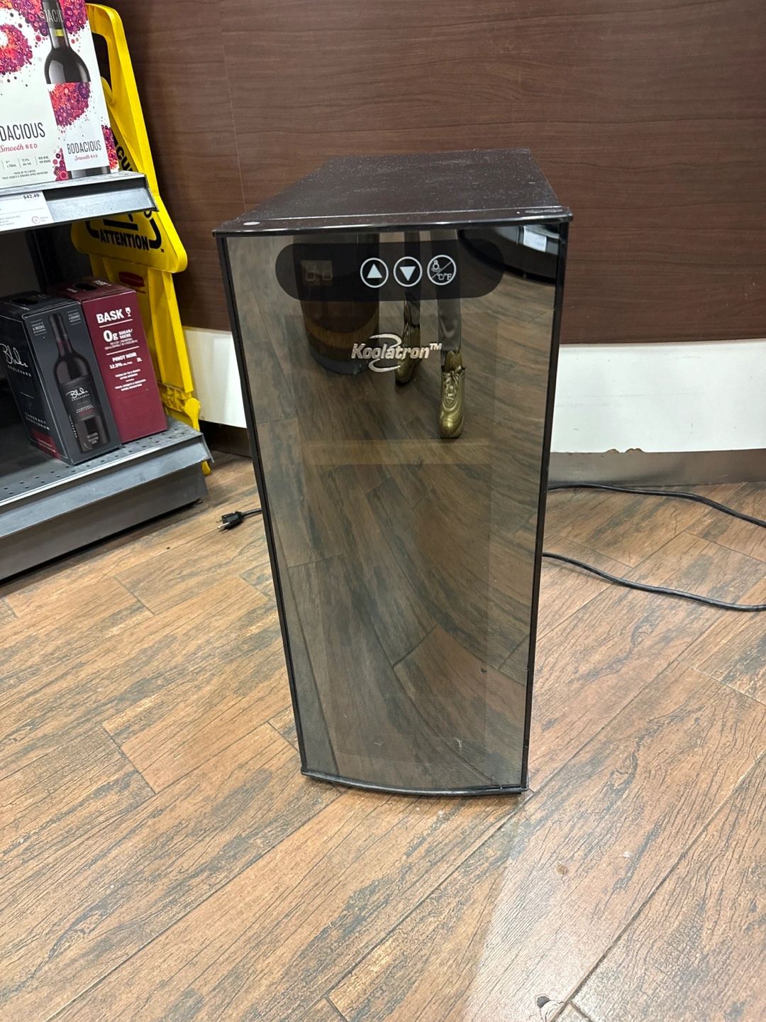 Black wine cooler. Small, freestanding unit. Glass door. Digital temperature control. Holds several bottles. Good condition. Used in store for a bit, we got a different one now. Lots of life left in it. π
