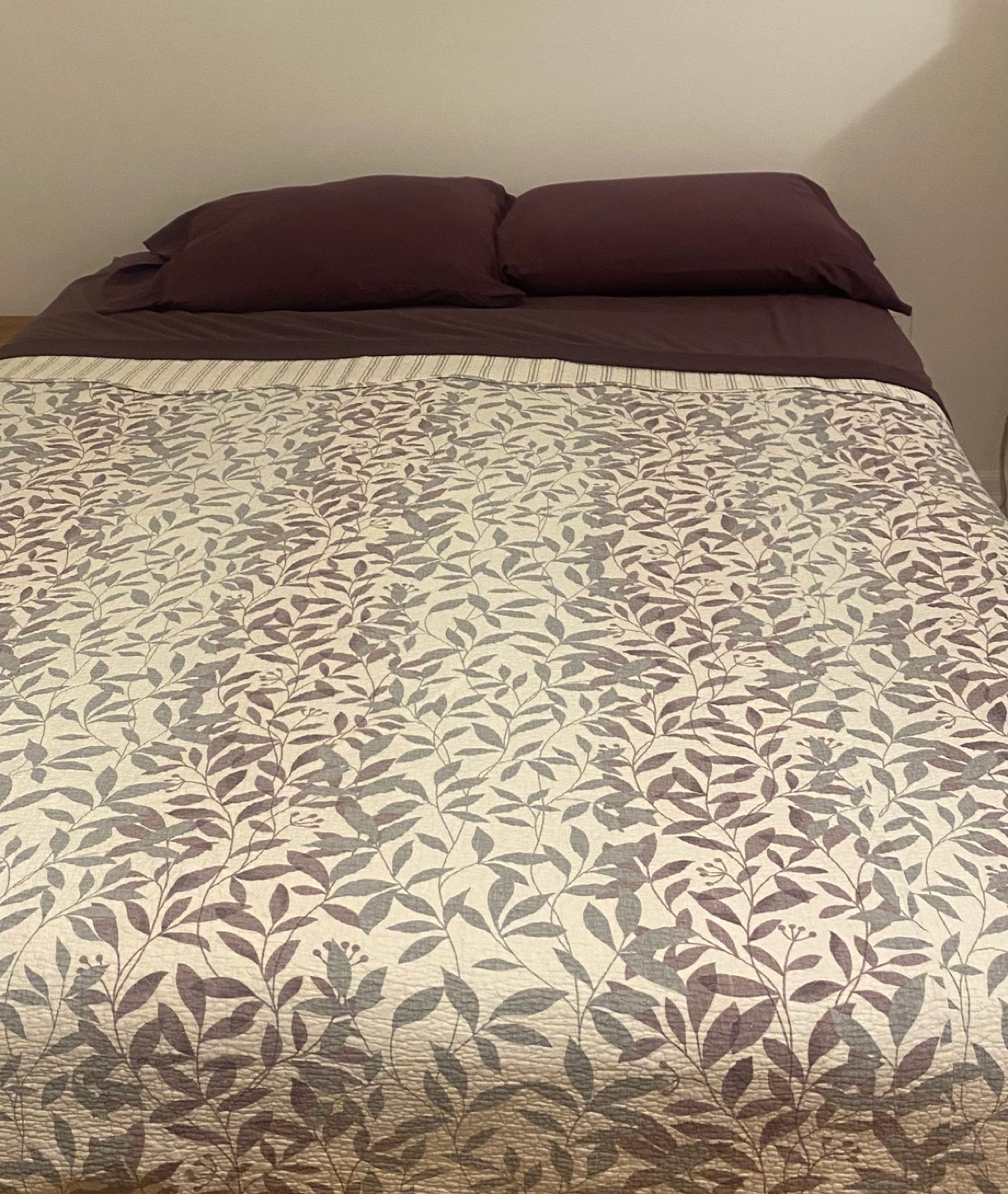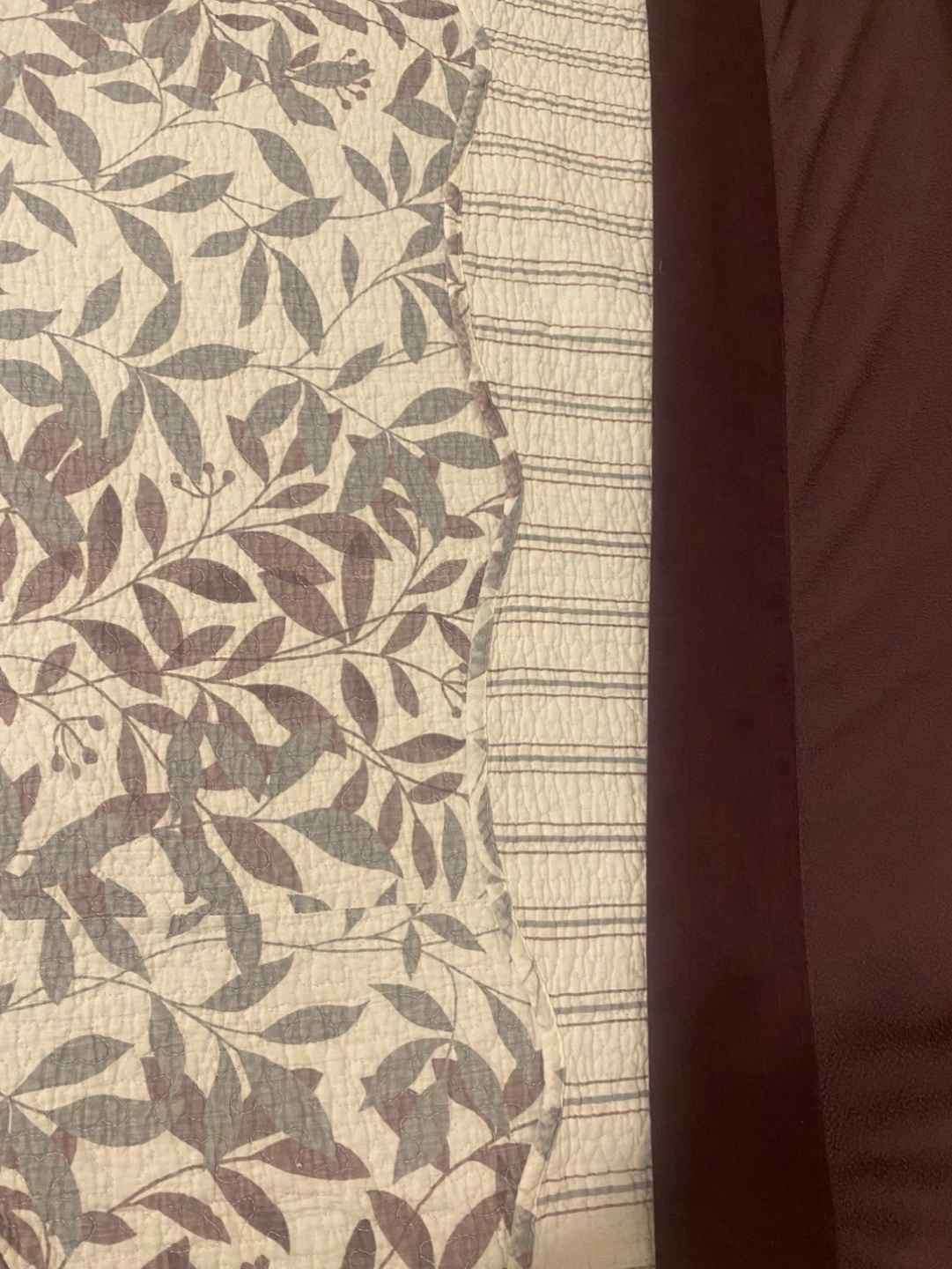 Queen size quilt . Features a gray and purple leaf pattern on a cream background and reversible to stripe. Includes purple pillowcases and a solid purple fitted and flat fleece fabric sheet set. Soft and cozy.