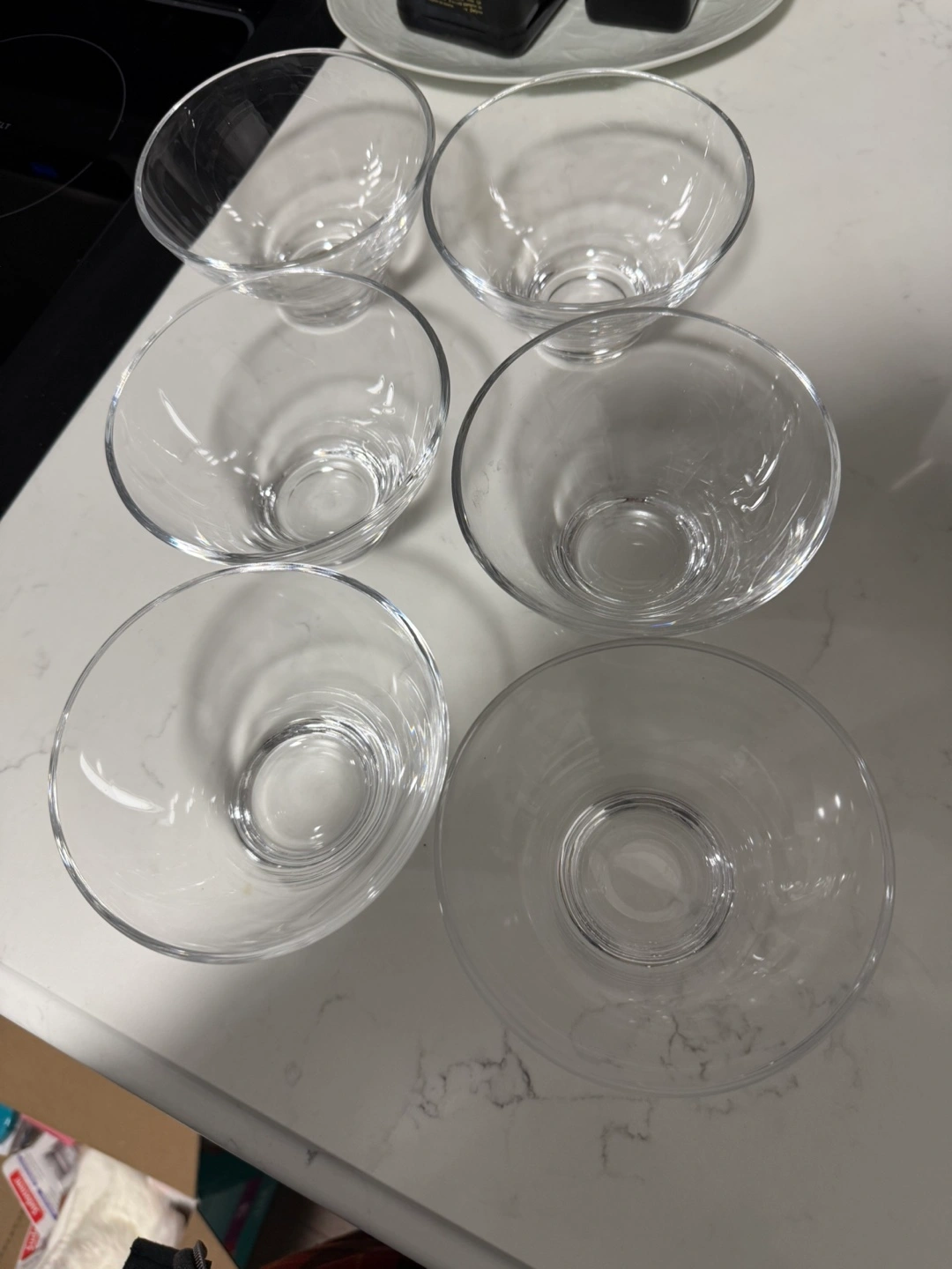 Six clear glass bowls. Perfect for serving snacks or desserts.
