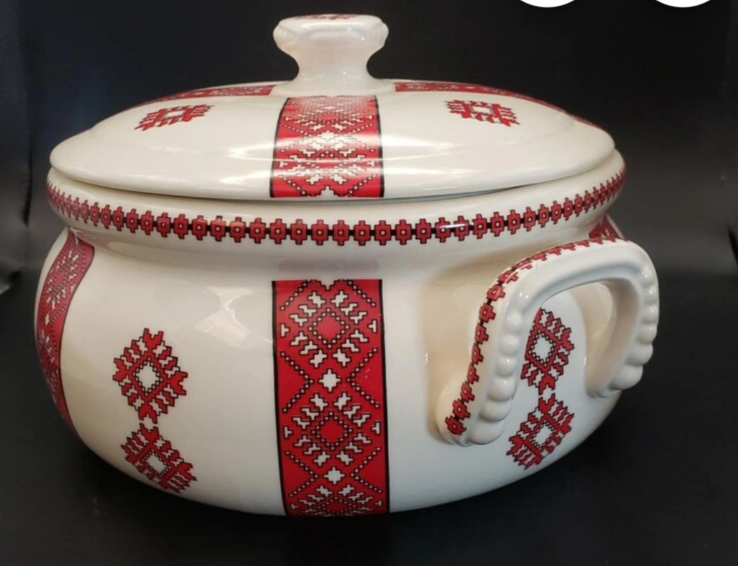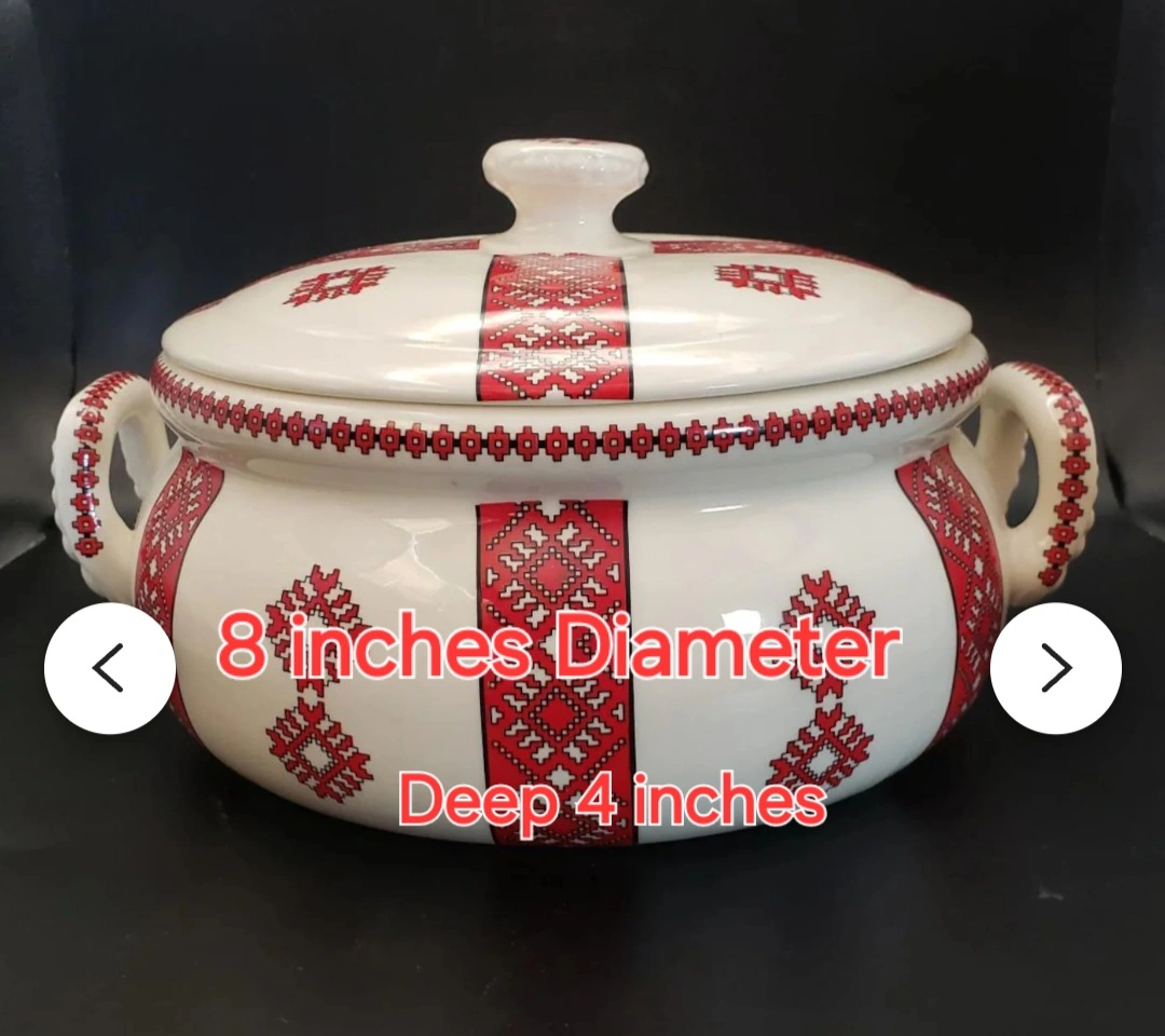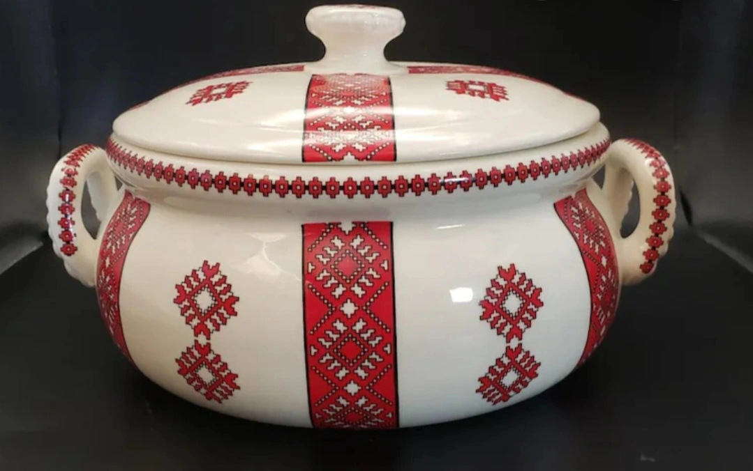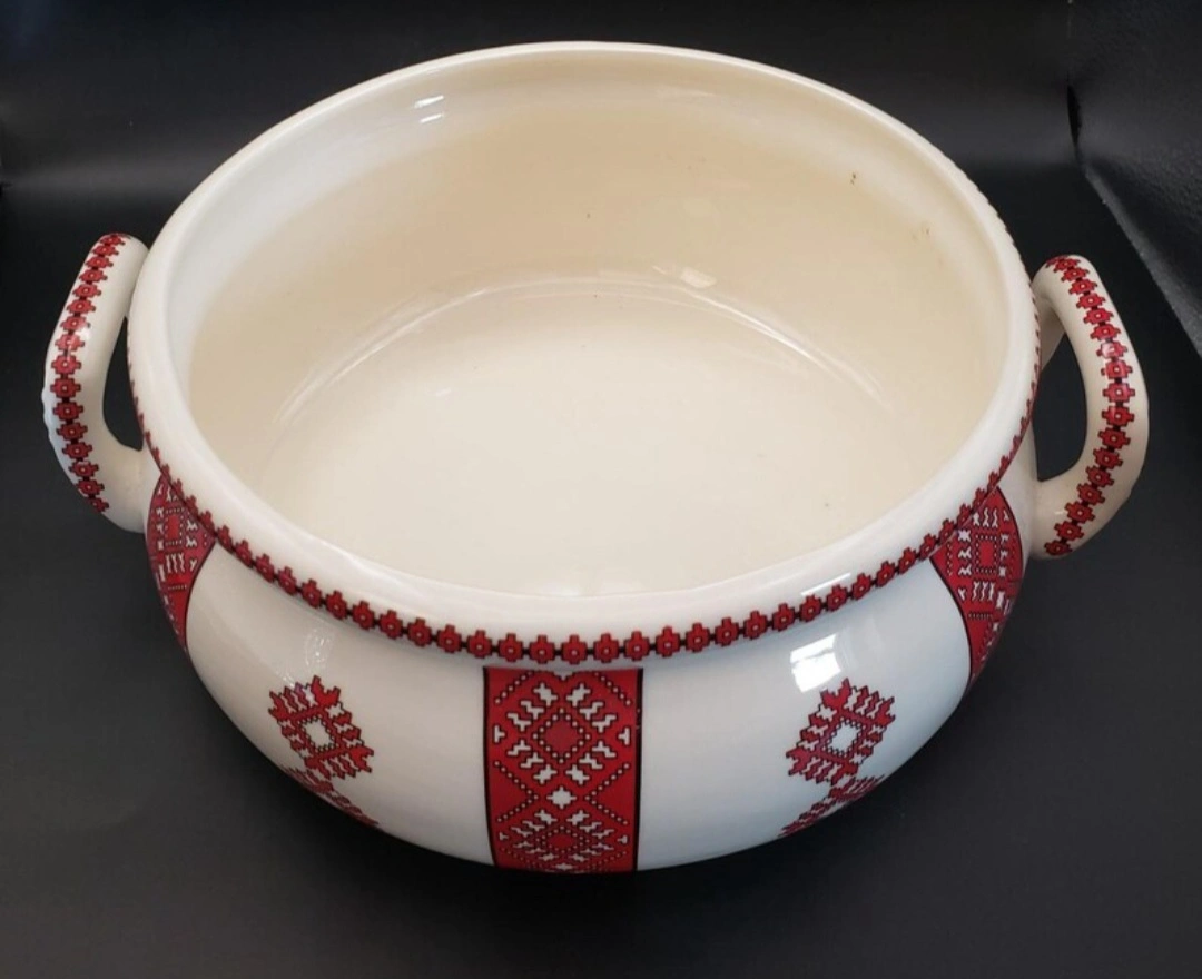 Beautiful vintage ceramic casserole dish. Features a cream base with a red and white embroidered-style pattern. Lid included. Perfect for serving or storage.