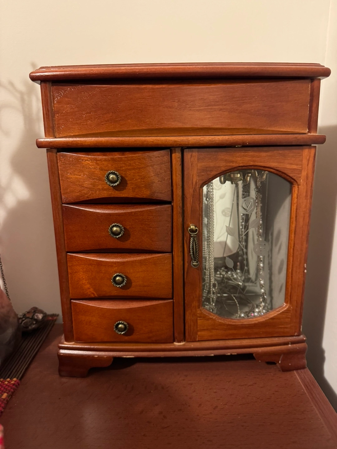 Beautiful wooden jewellery armoire. Four drawers and a glass-door compartment. Perfect for storing and displaying jewellery.