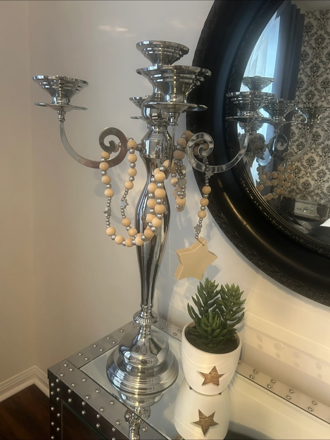 Tall silver metal candelabra. Five candle holders. Ornate design. Elegant centrepiece. Measures approximately 30 inches tall.