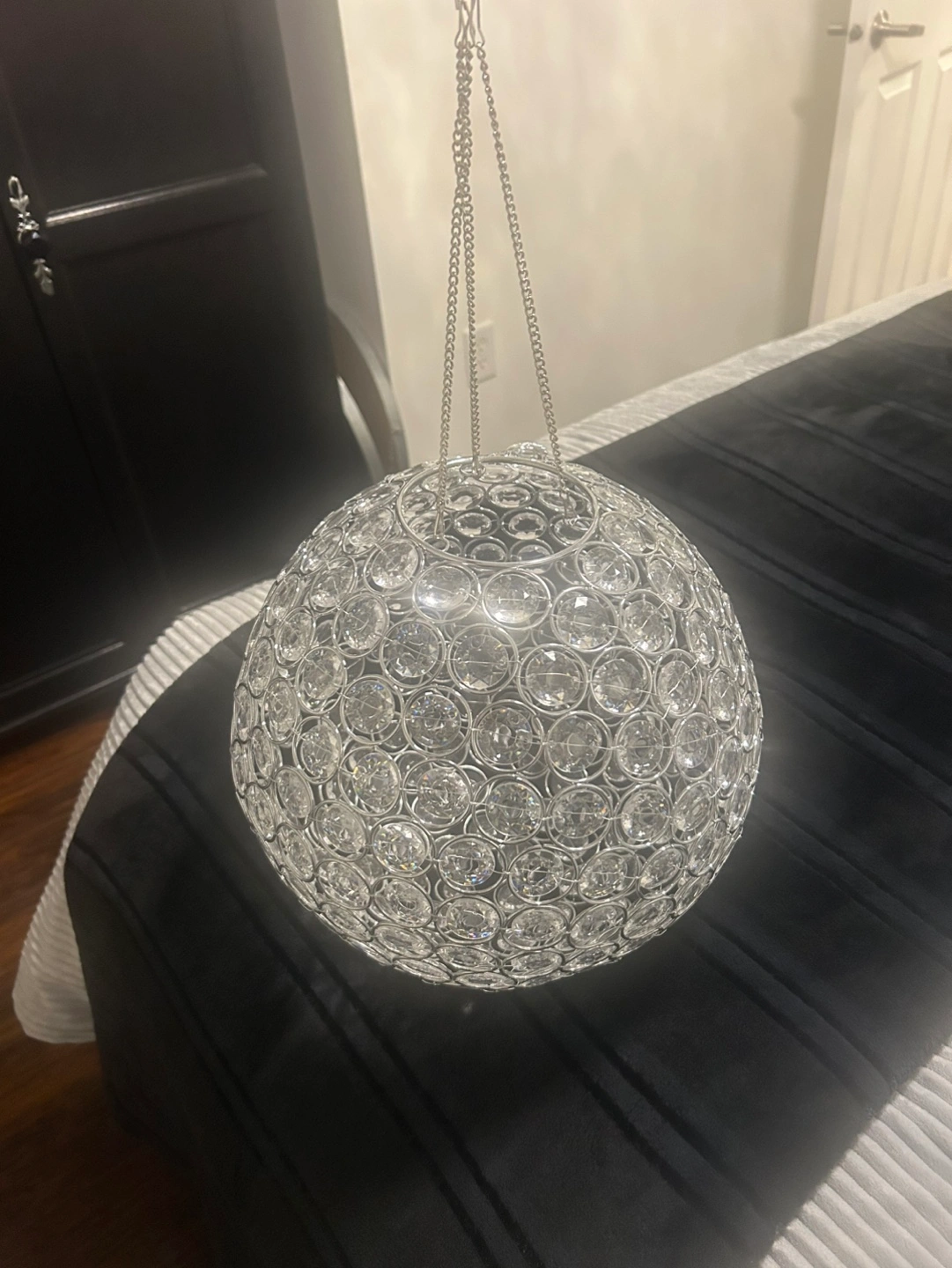 Gorgeous crystal ball candle holder. Features clear crystals and a silver metal frame. Hangs from two thin chains. Perfect for adding a touch of elegance to any room.