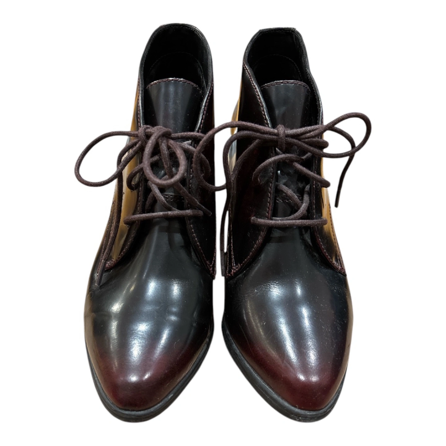 94Shiny very good condition pair of women's leather ankle boots from Clarks Artisan. Dark burgundy colour. 3 inches Block heel. Lace-up front. Pointed toe. No scratches on leather. Very comfortable for walking. Feel free to contact for product details.