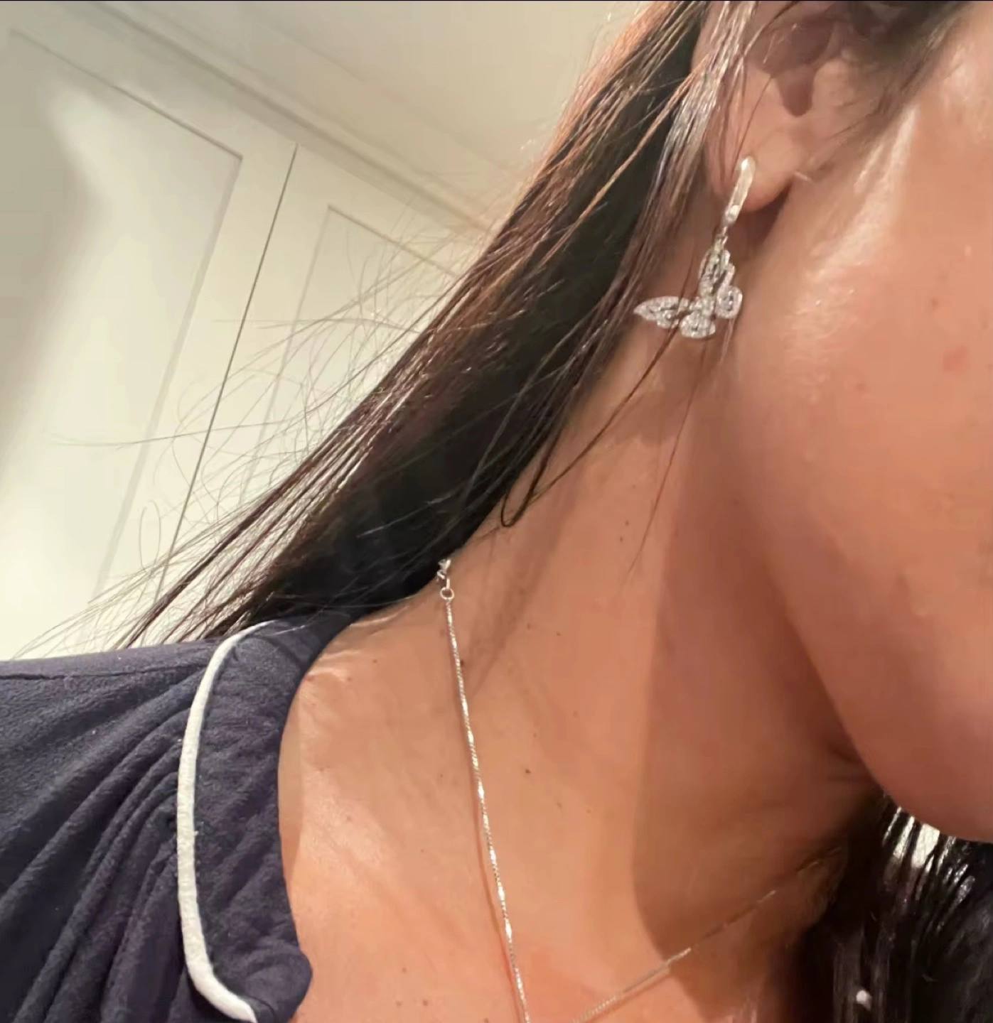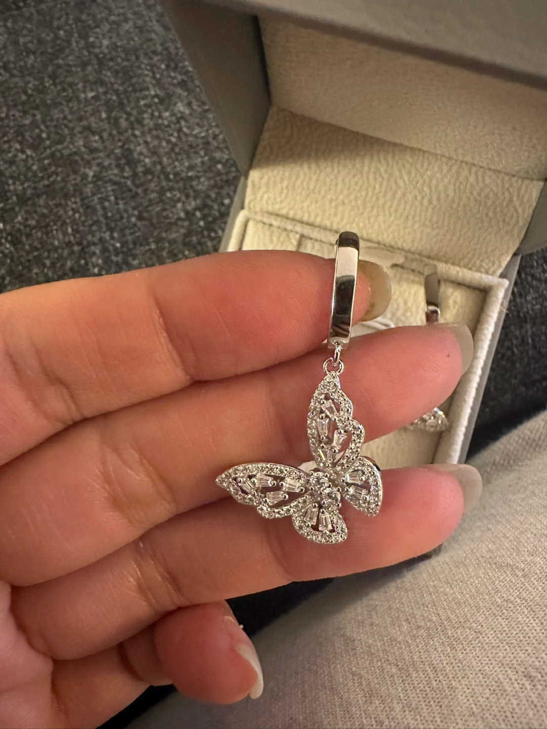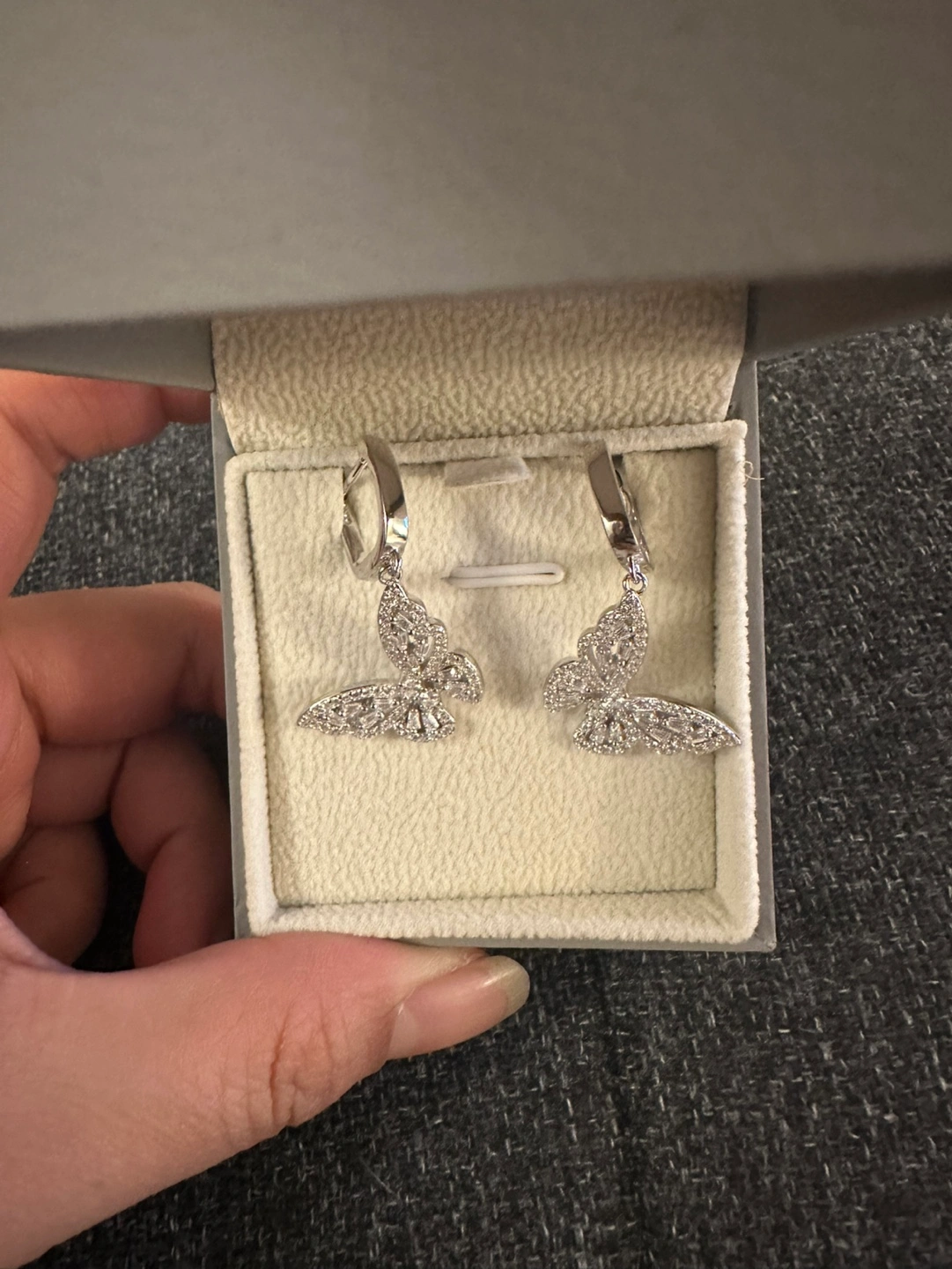 119Stunning pair of butterfly earrings. Silver-toned metal. Clear stones. Comes in original box.