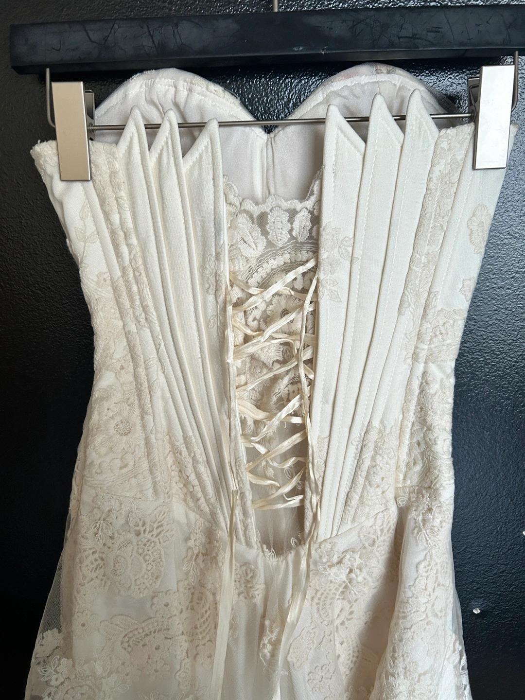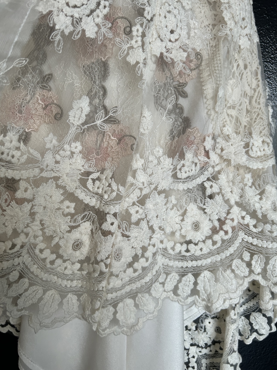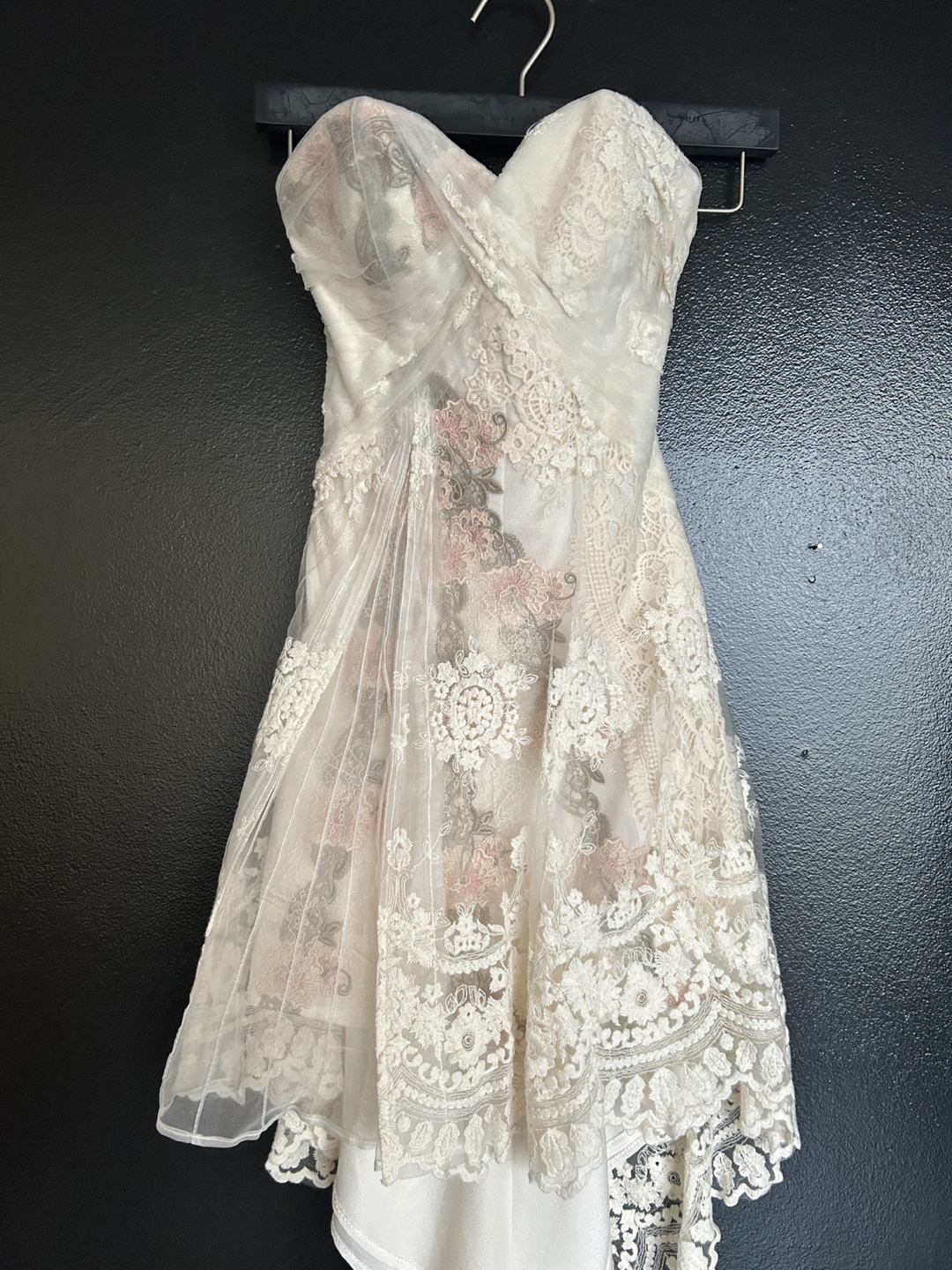 Hand made lace dress. Strapless sweetheart neckline. Corset back with lace-up closure. Layered tulle skirt.