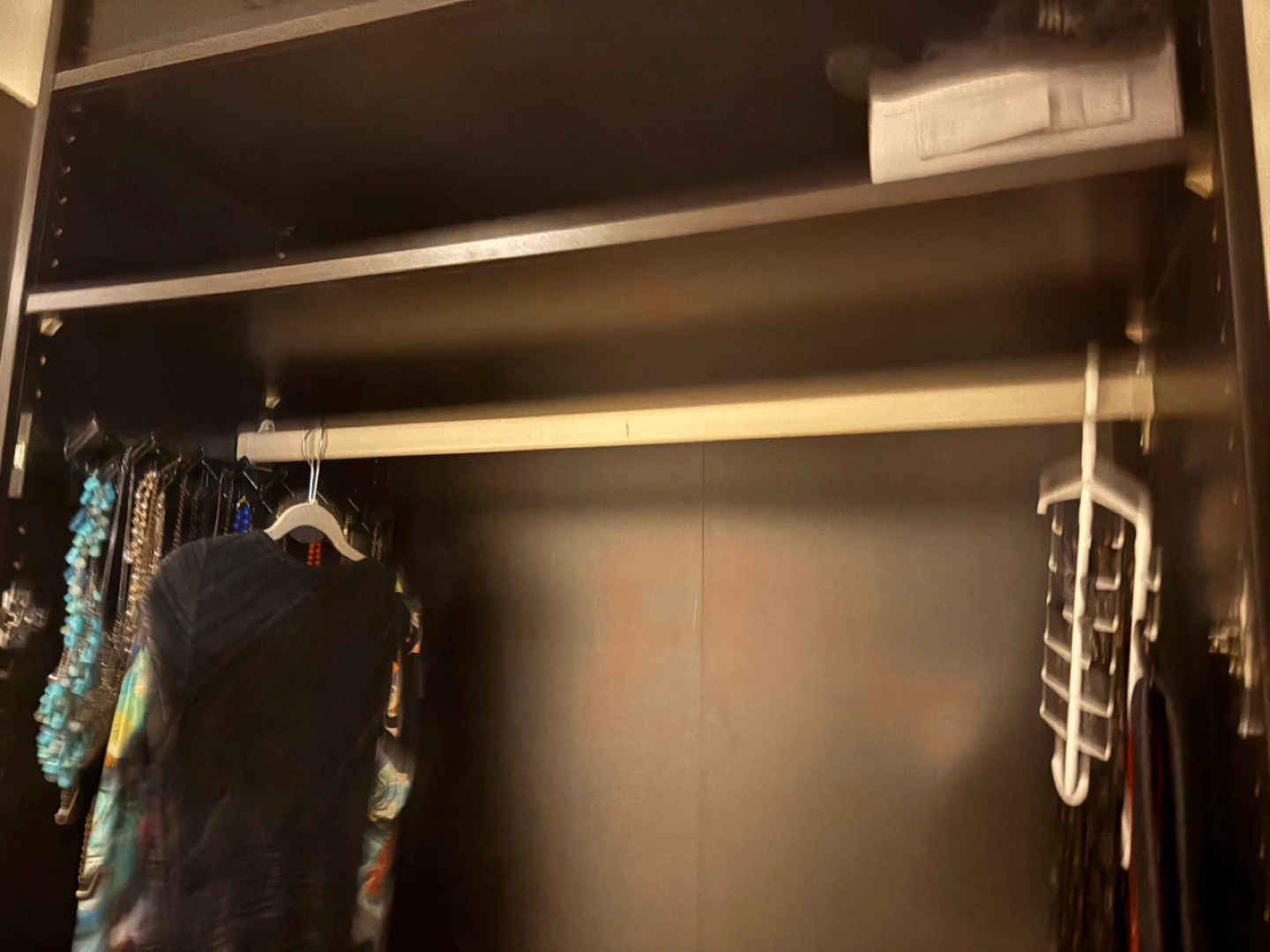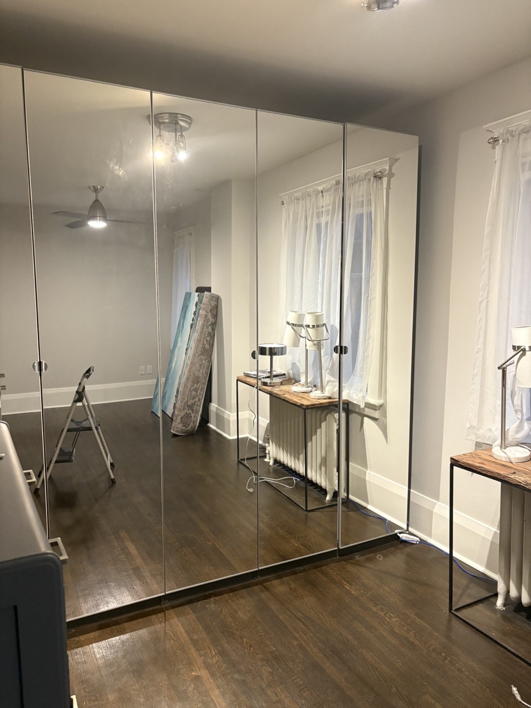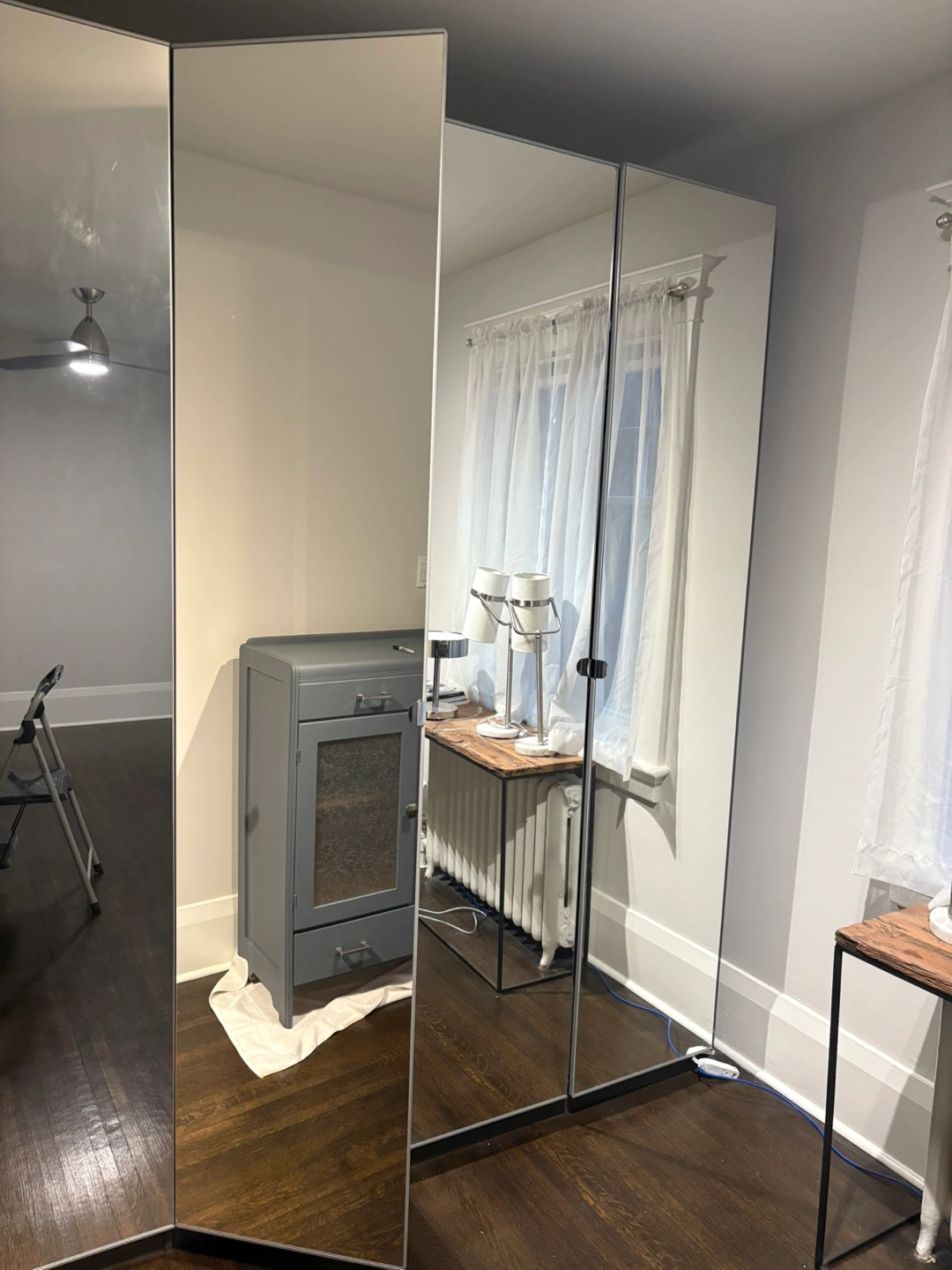 6 mirrored doors with hinges for IKEA Pax wardrobe. 90.5 x 19.5. Also 4 hanging rods (38 inches) and dark wood shelves (22.75 x 38).