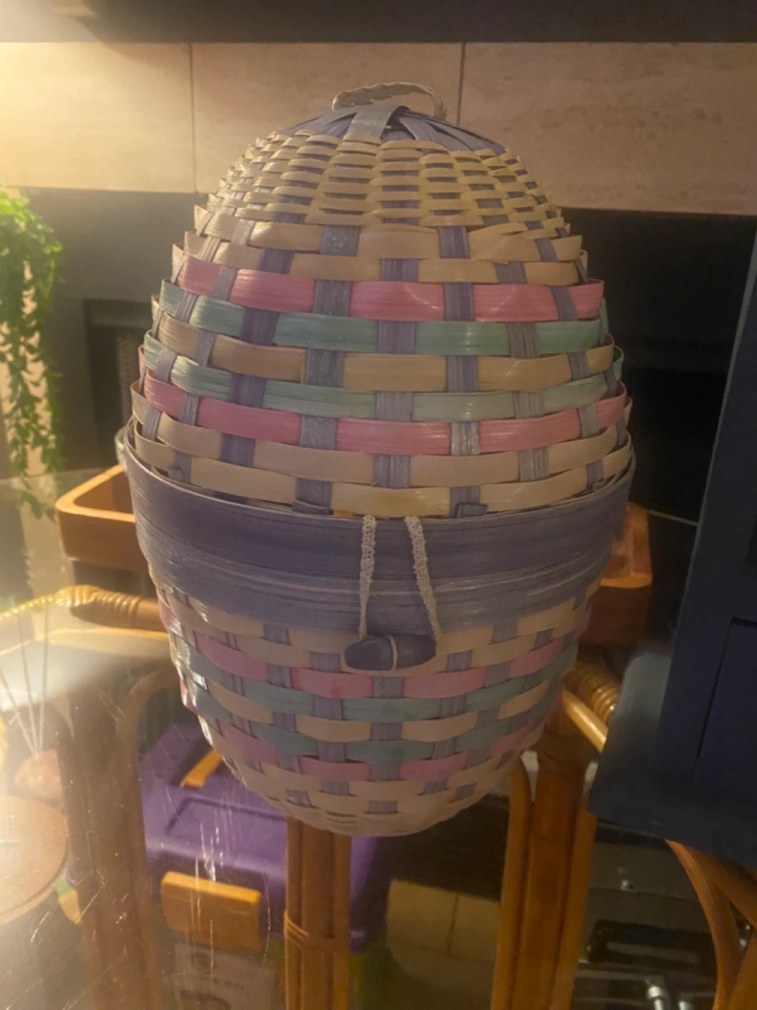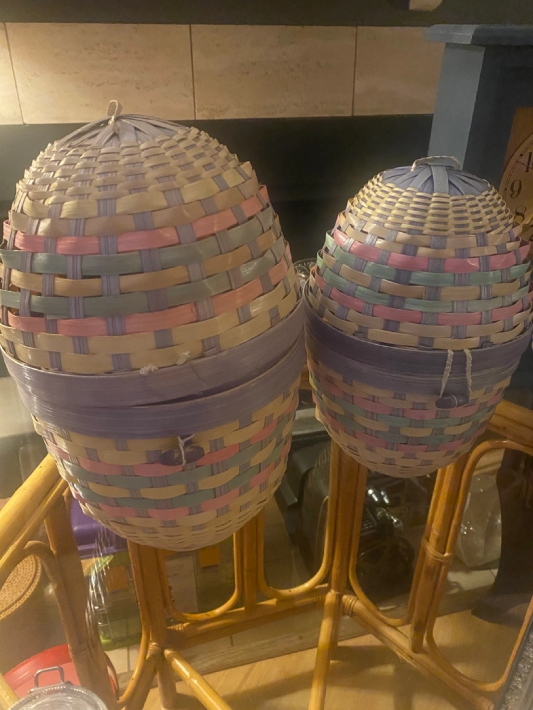 Two pastel coloured woven baskets. Oval shape. Perfect for Easter decor or storage. Varying sizes. One is missing button to close it… but regardless basket stays closed I would use these in place of a gift basket for my kids. They are too big now :)