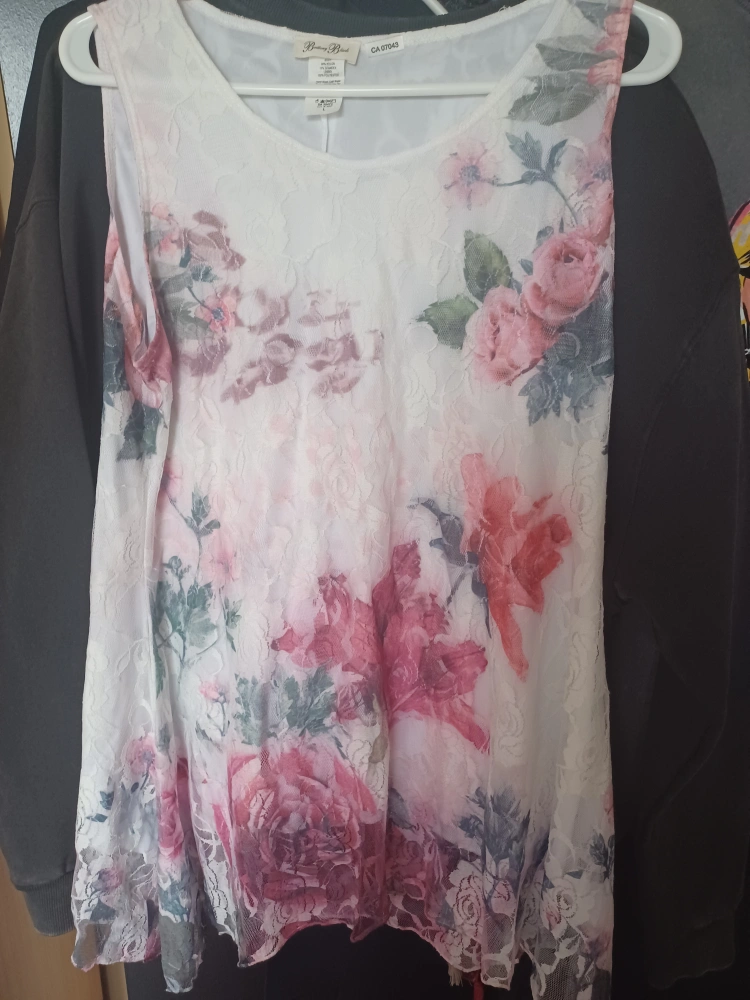 Women's sleeveless top. Floral print on lace fabric. Size large. 90% nylon, 10% spandex. Lining: 100% polyester.