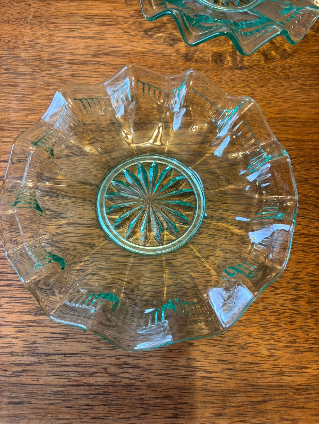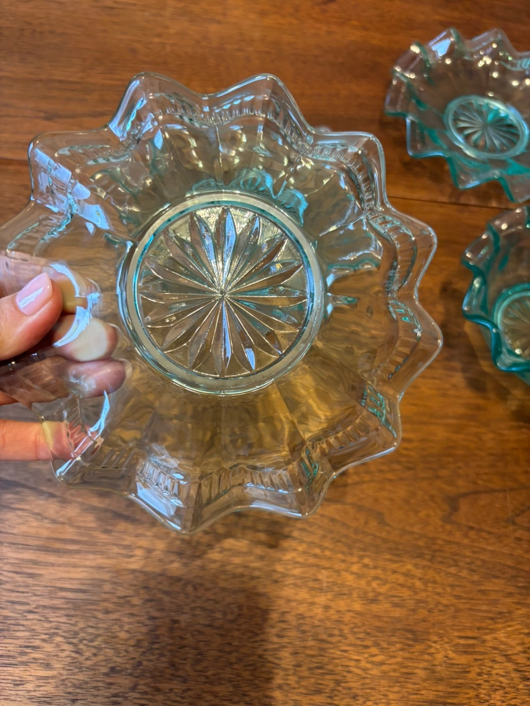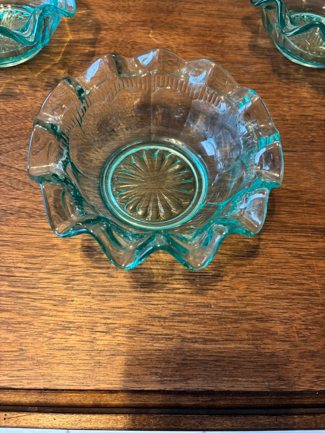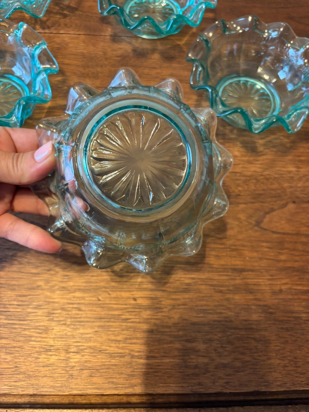 Vintage Bohemia Glass/Crystal Capri aqua coloured filled plate and bowl set from Czech Republic. Frilled edges and decorative design with starburst centre. Includes 4 bowls at 5” wide and 3 plates at 6.5” wide.