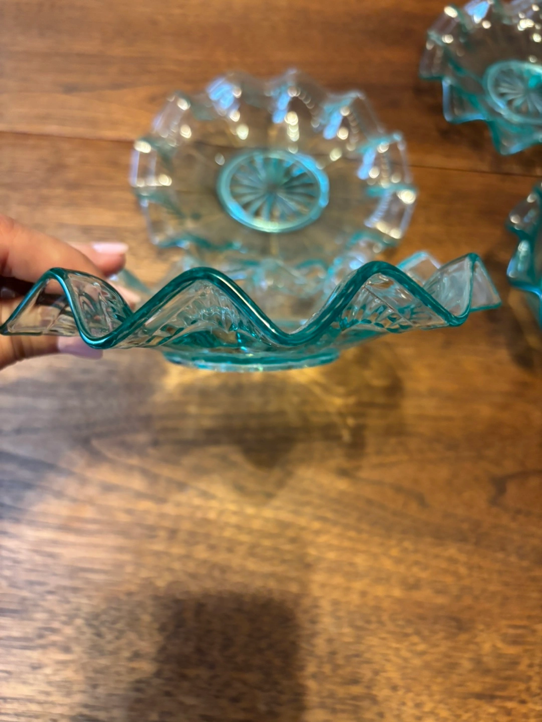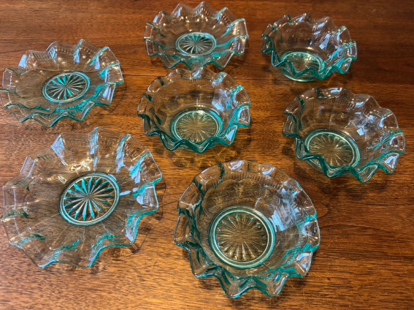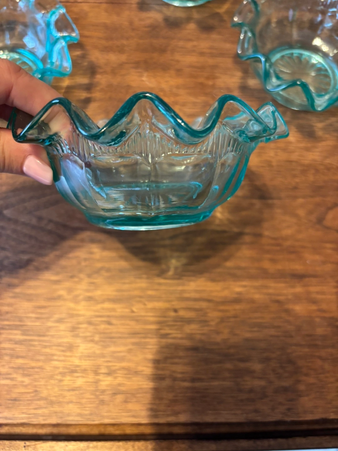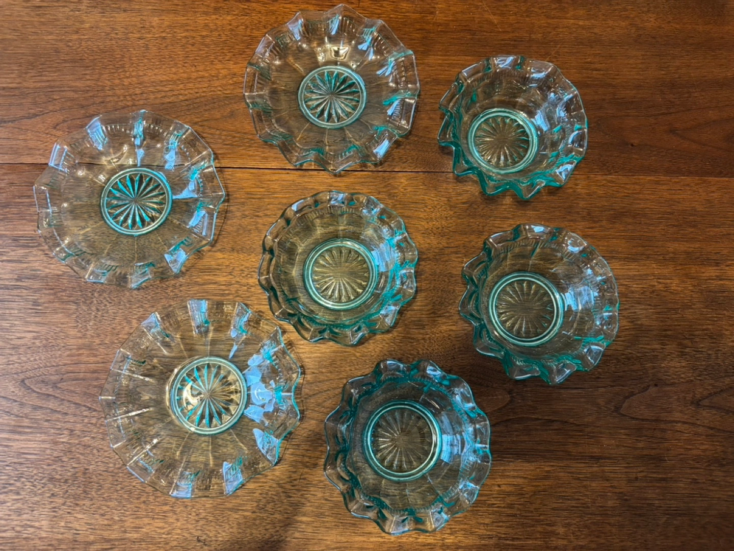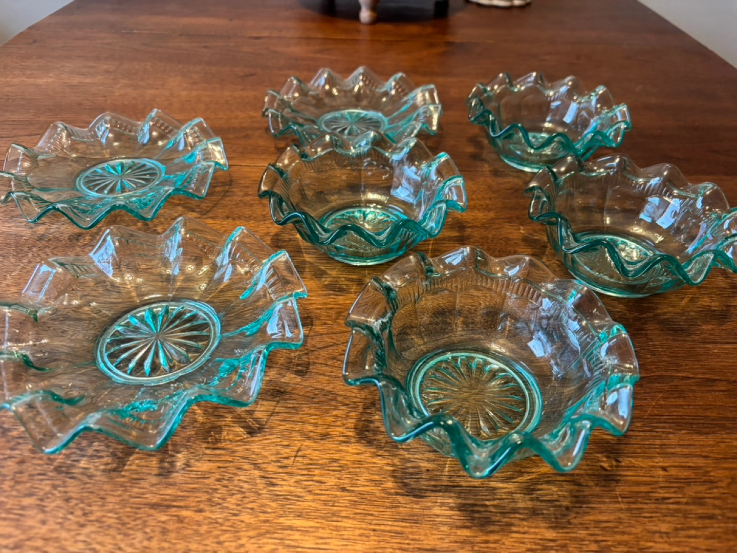 Vintage Bohemia Glass/Crystal Capri aqua coloured filled plate and bowl set from Czech Republic. Frilled edges and decorative design with starburst centre. Includes 4 bowls at 5” wide and 3 plates at 6.5” wide.