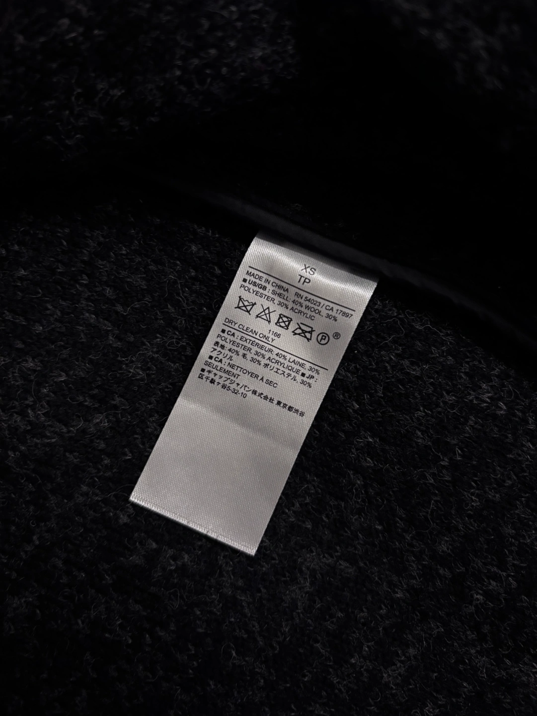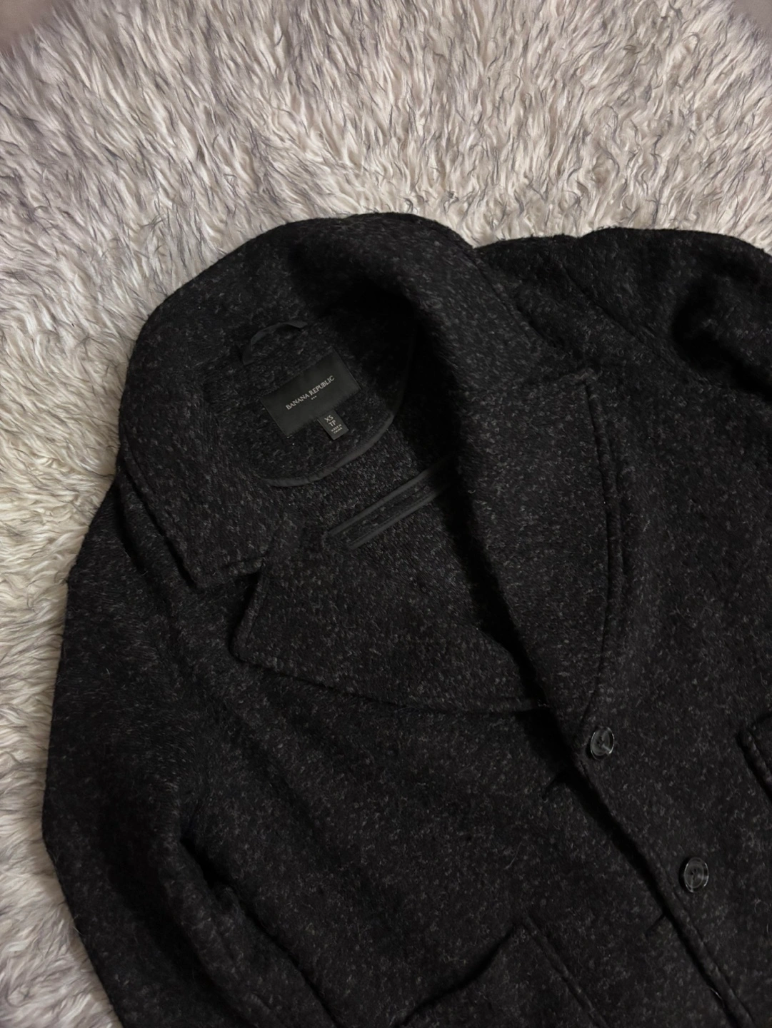 Long-sleeved black coat. Features a notched collar, button closure, and patch pockets.