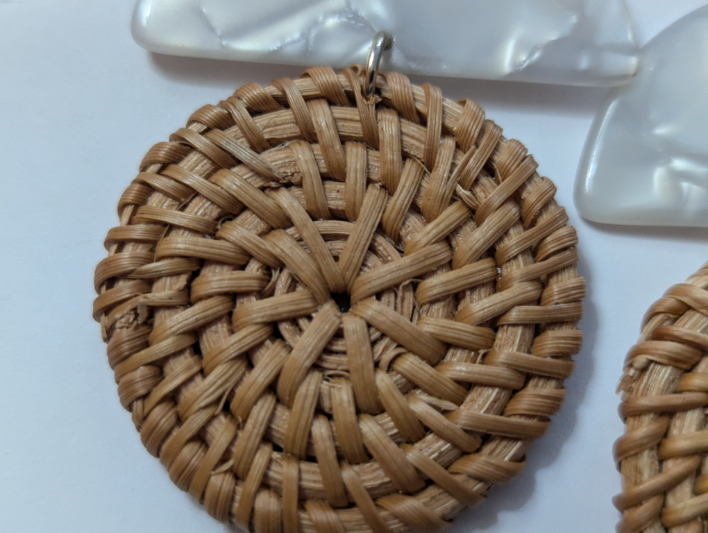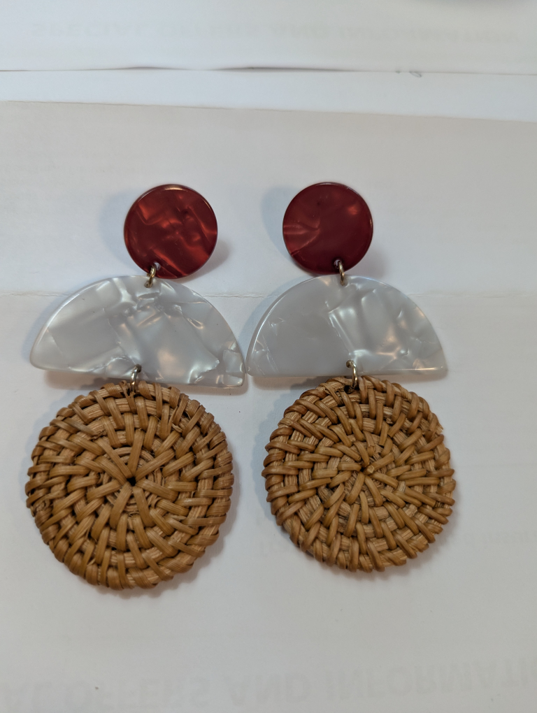 Stunning statement earrings. Features a combination of materials: burgundy resin, white marbled resin, and woven rattan. Lightweight and stylish.