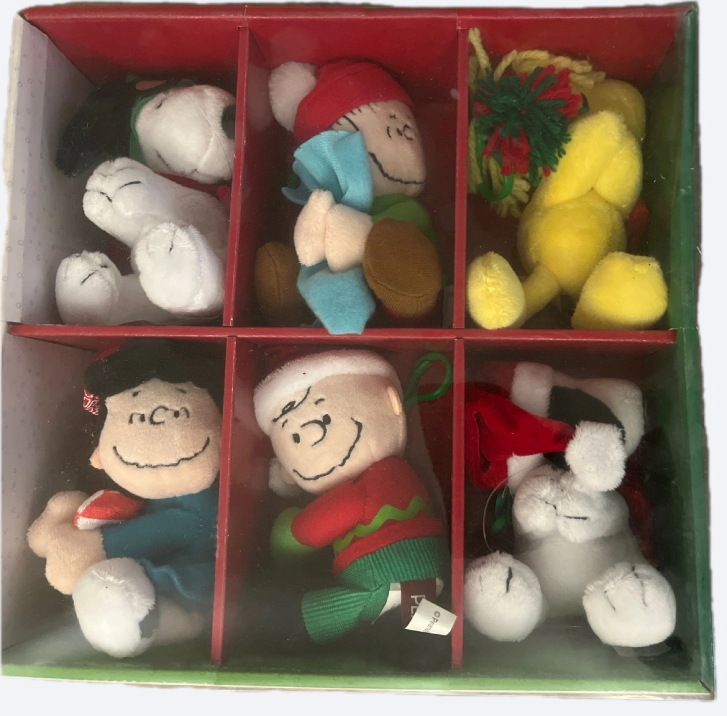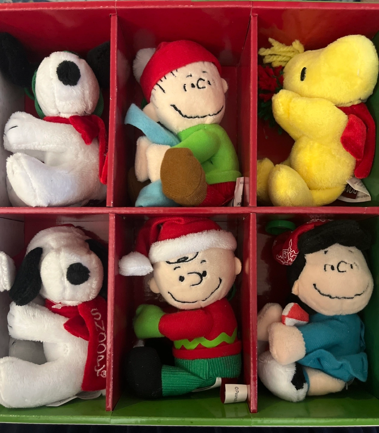 Six mini plush figures. Characters include Snoopy, Charlie Brown, Lucy, Linus and Woodstock with Box. Holiday themed outfits. Collectible item. Perfect gift. Usually cost $30 for a set of Charlie Brown and Snoopy only. OPEN TO OFFER.