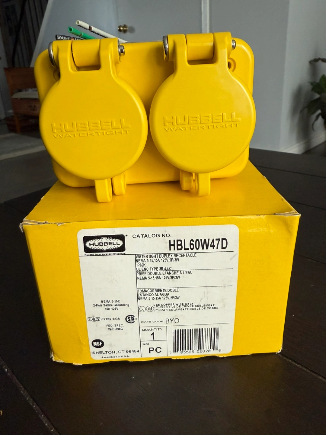12New in box. Hubbell HBL60W47D Watertight Straight Blade Duplex Receptacle