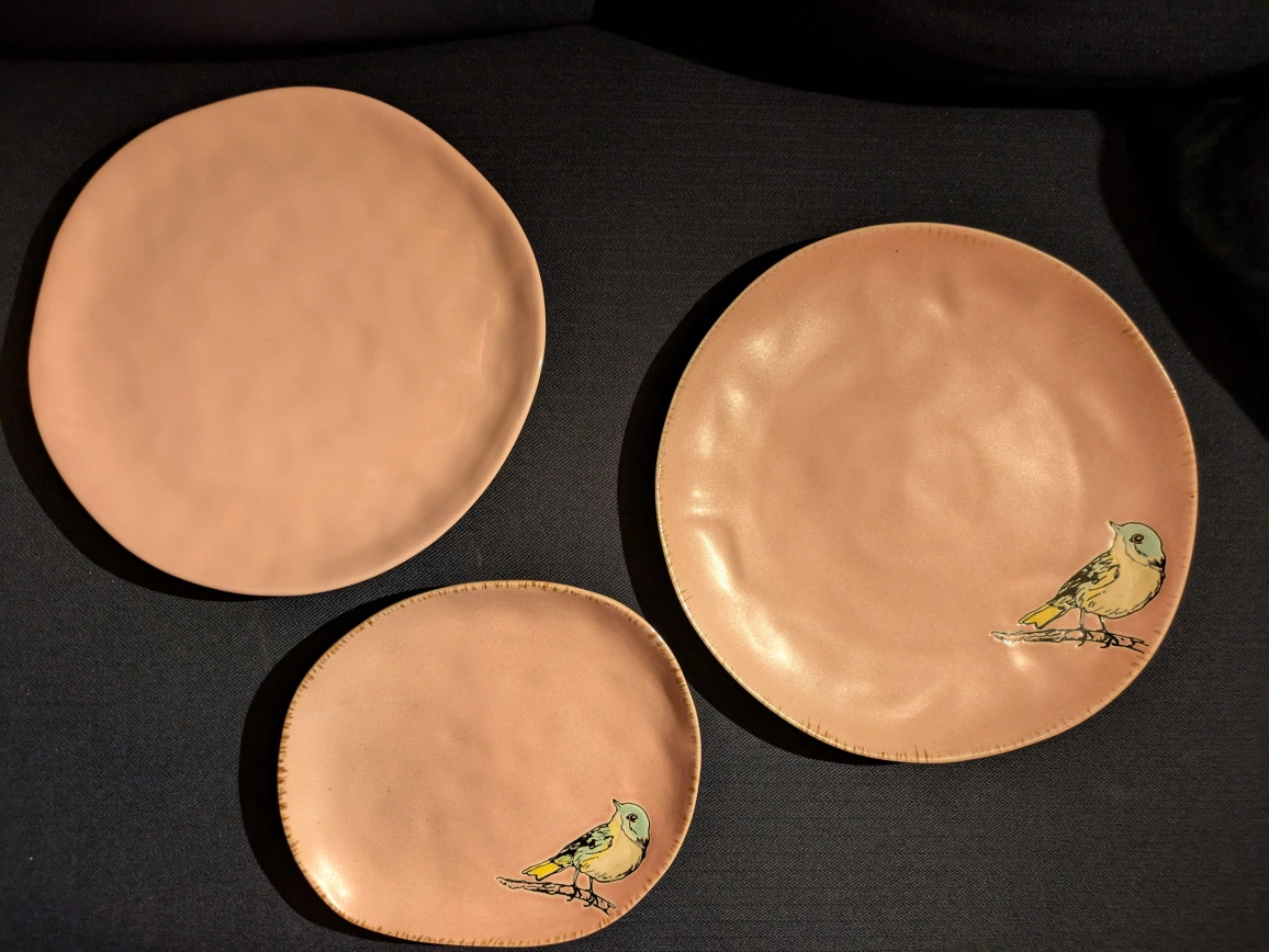 Set of three decorative ceramic pink plates. Two larger plates and one smaller plate. Two plates features a small bird. Plates have a bumpy texture.