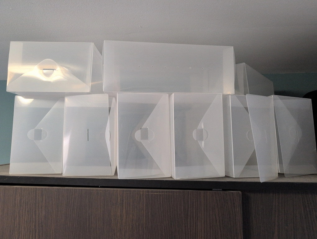 Set of 10 clear plastic shoe storage boxes. Stackable design. Great for organizing shoes or other items.