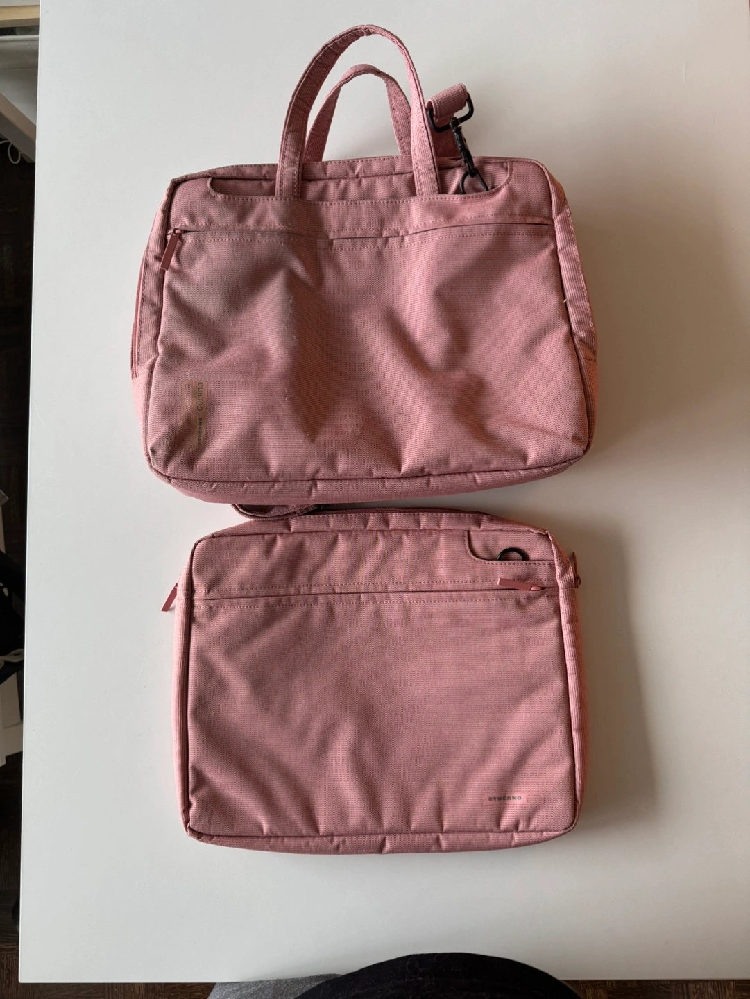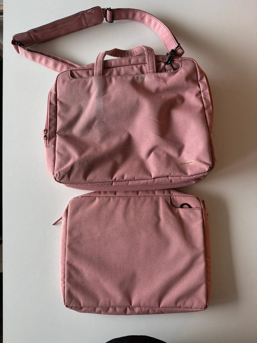 A lovely set includes a laptop bag and a sleeve. Both are a dusty rose pink colour. Features a shoulder strap and top handles. Great for carrying your laptop and accessories. Durable material.