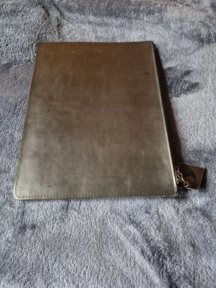Black leather-look zipper pouch. Features embroidered logo. Great for travel or everyday use.