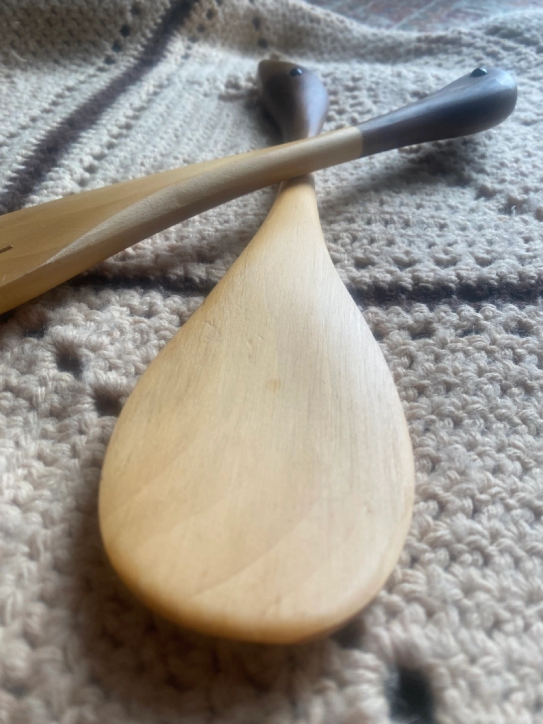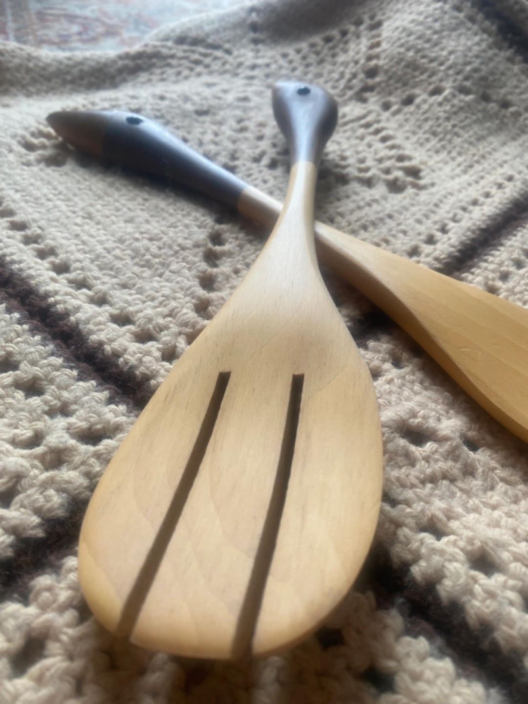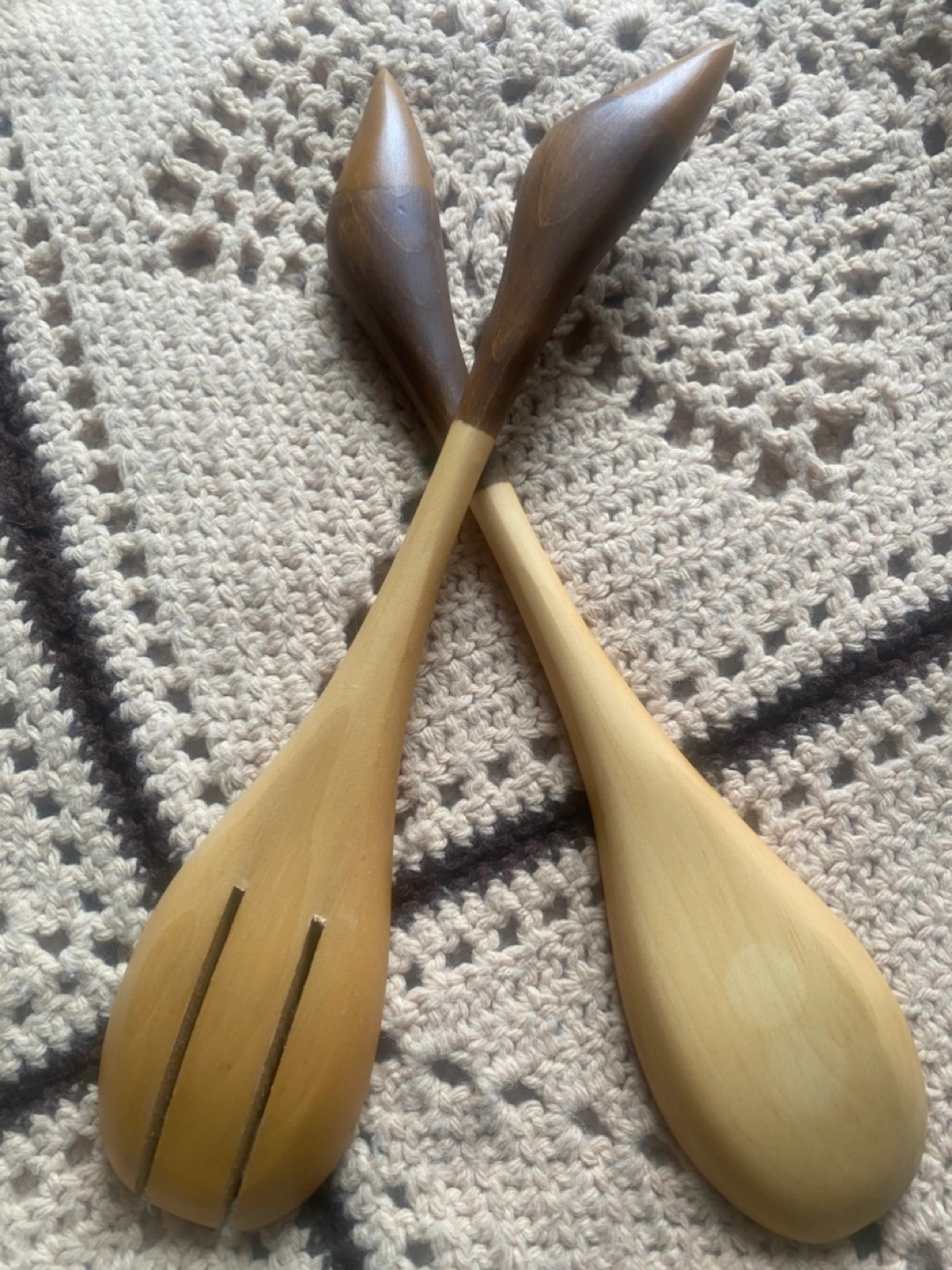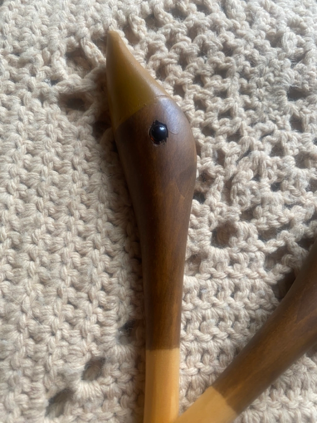 Unique handmade salad servers. Feature carved duck heads. Light and dark wood tones. One server features a spoon shape, the other a slotted serving end.
