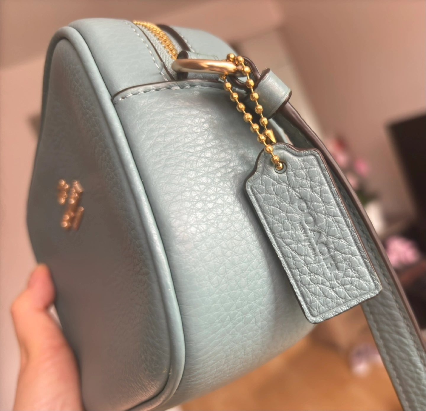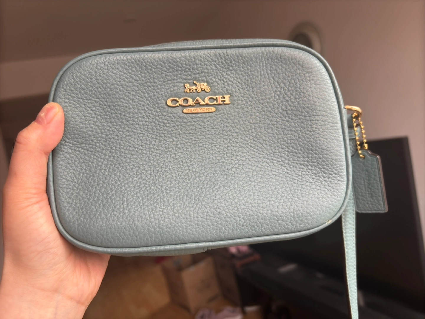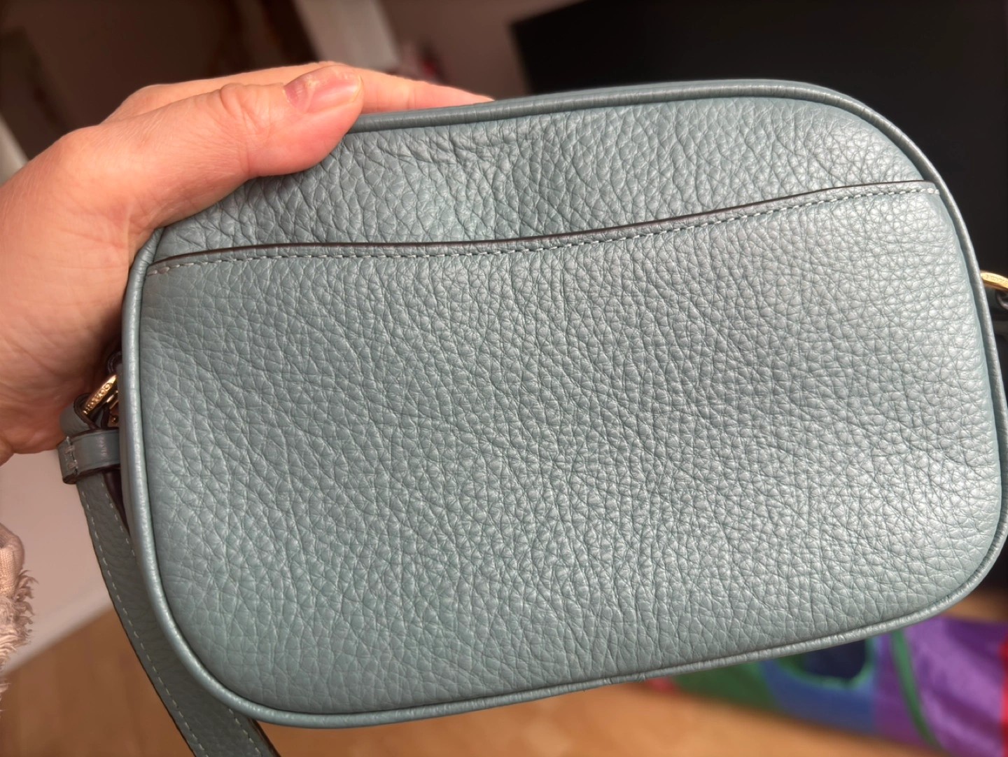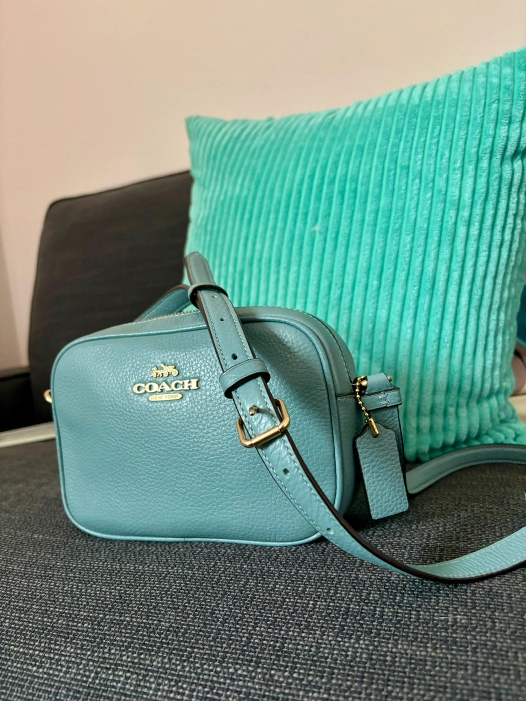 Light teal soft leather crossbody bag. Adjustable strap. Small size, perfect for essentials. Mint 9/10 condition.