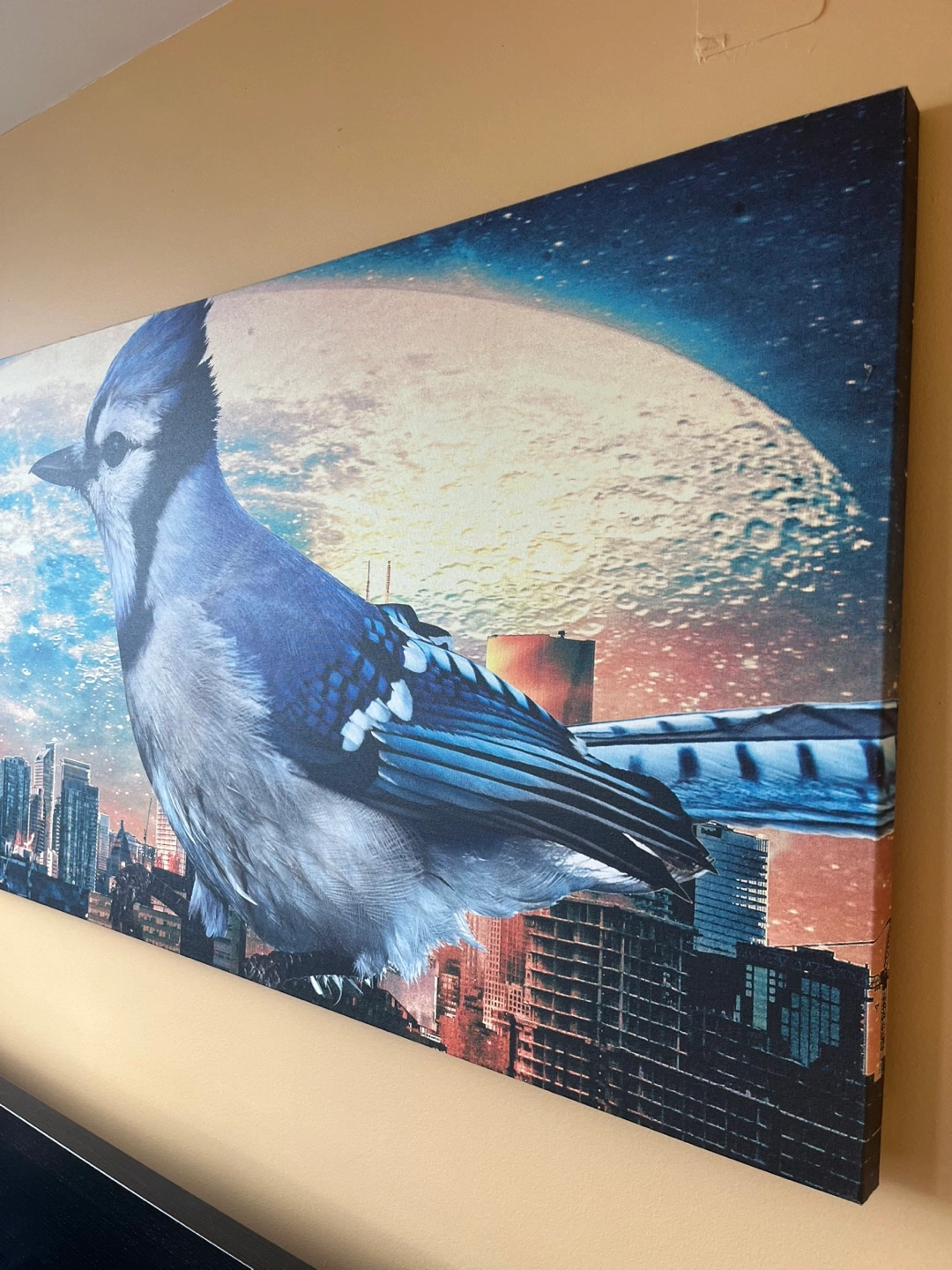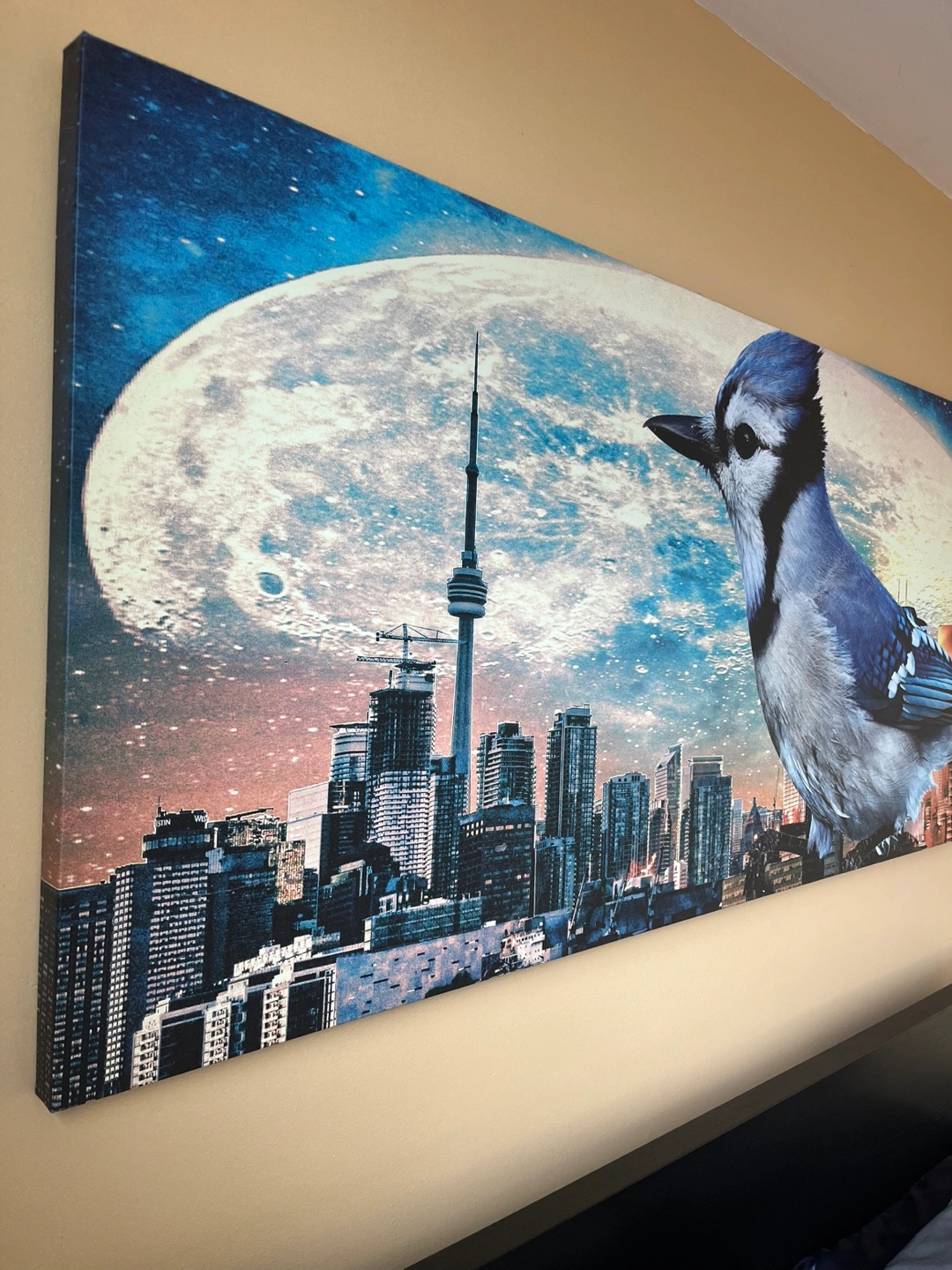 One of a kind piece. Large Blue Jay overlooking the skyline of Toronto with enlarged moon in the background. Like new. Canvas is wrapped over the frame. Originally bought at $500.