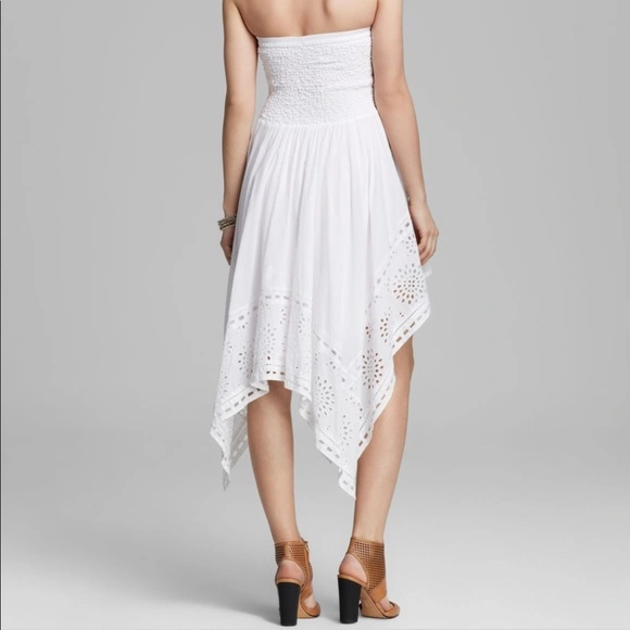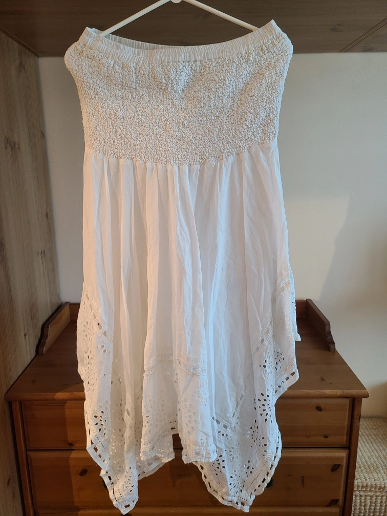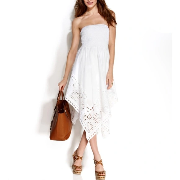 Stunning white eyelet dress. Strapless tube design. Asymmetrical hemline. Features beautiful eyelet detailing. Perfect for summer.