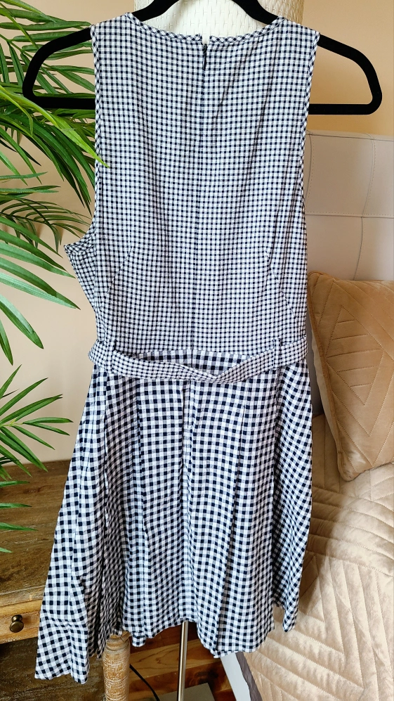 Adorable gingham mini dress. Sleeveless design. Features a pleated skirt and a belted waist. Back zipper closure.