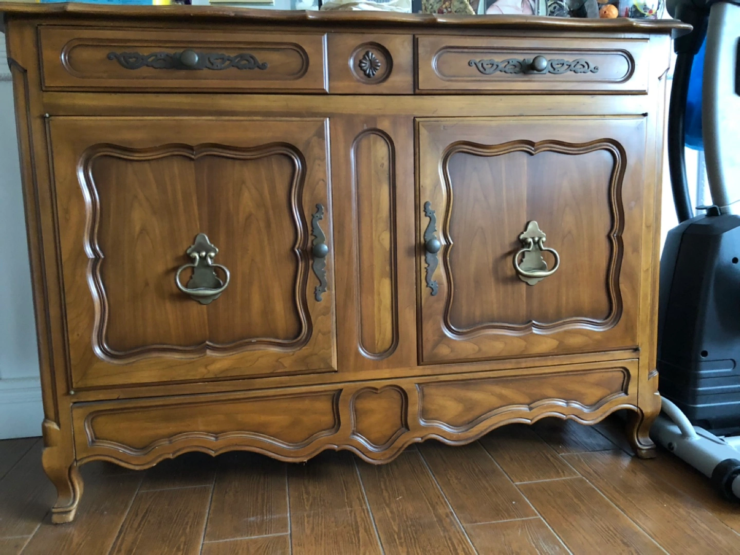 Wooden sideboard cabinet. Two doors, two drawers. Ornate detailing. Brass hardware. Ample storage space. French provincial style.