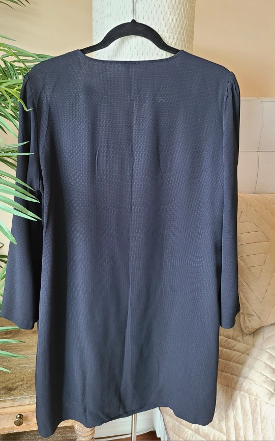 Elegant navy blue dress. Features a lace-up detail at the neckline. Three-quarter sleeves. Relaxed fit. Made in Portugal.