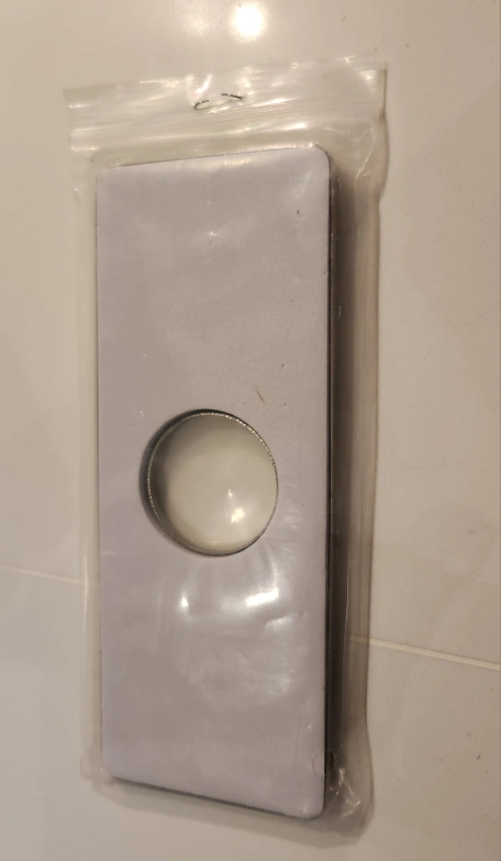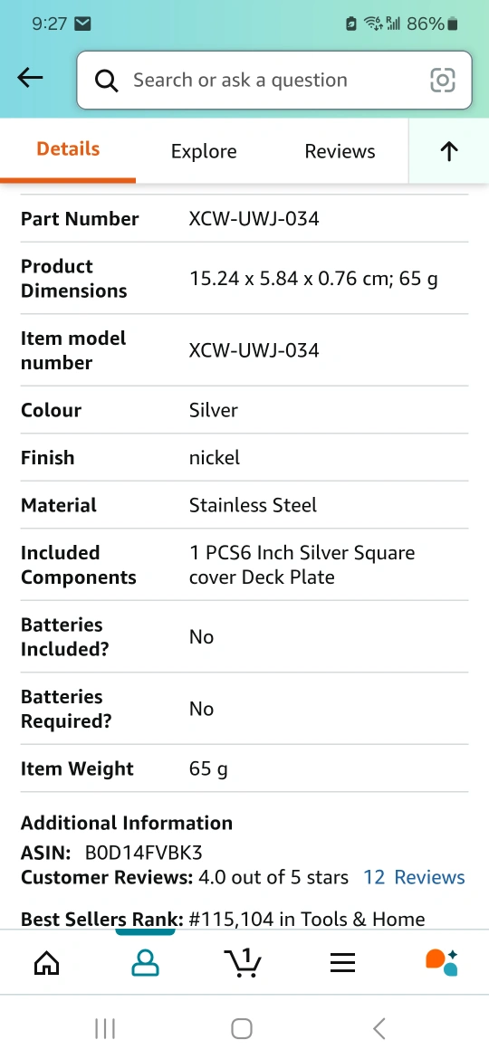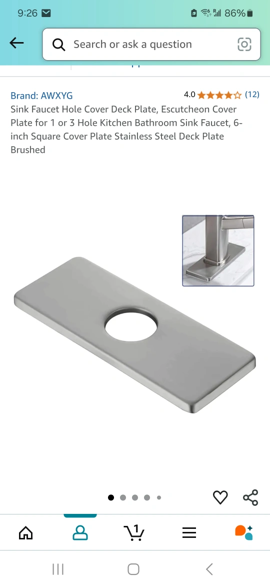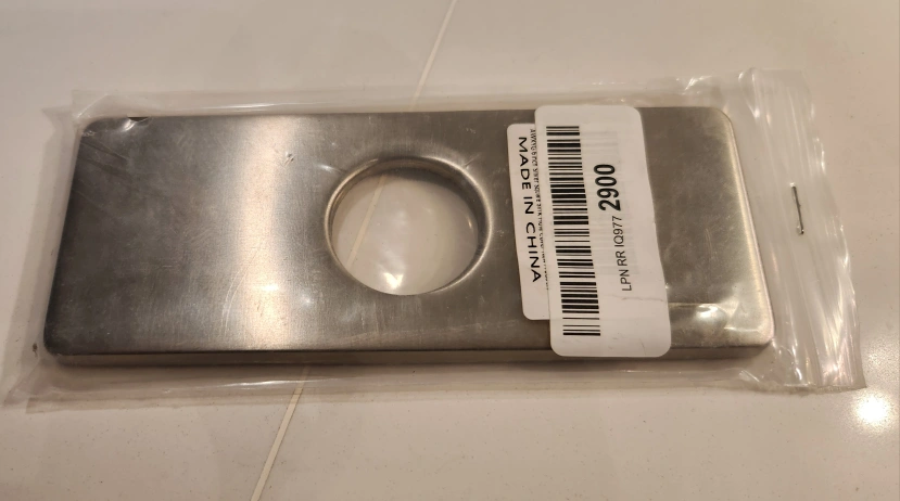 339~ Brushed Nickel (flat finish) 6" Square Sink Faucet Deck/Cover Plate Stainless Steel sink ~ Fits most 1- 3 hole kitchen/bathroom sink faucets ~ Foam/silicone backing ~ New in package ~ Bought to use in RV with new faucet but didn't install so will not need deck plate either ~ Uploaded the Amazon specs Paid $11.19 Asking $10.00