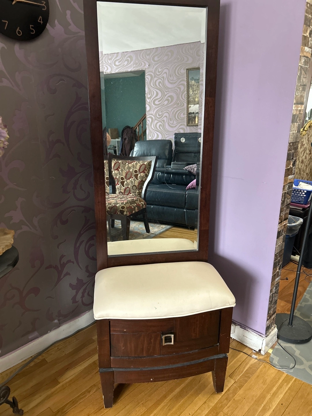Free standing vanity mirror. Features a cushioned bench and small drawer. Dark wood frame. Perfect for a hallway or small space.