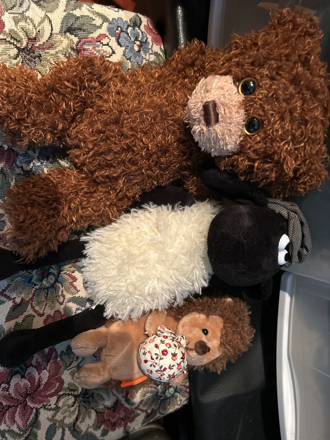 734Set of three cuddly plush toys. Includes a brown bear, a white sheep, a black sheep, and a hedgehog. Great for children or collectors. Gently used.