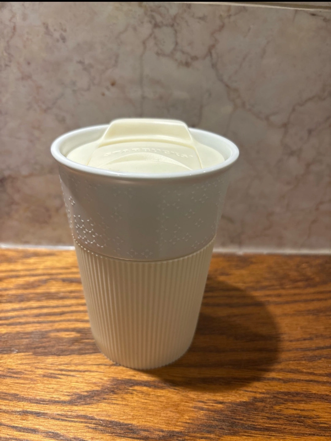 68White ceramic travel mug. Features a ribbed design and a subtle patterned band. Includes a plastic lid. 8oz capacity.