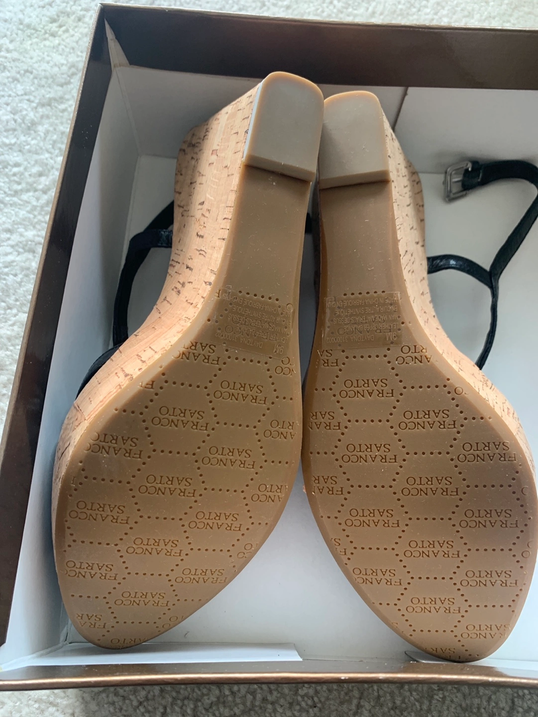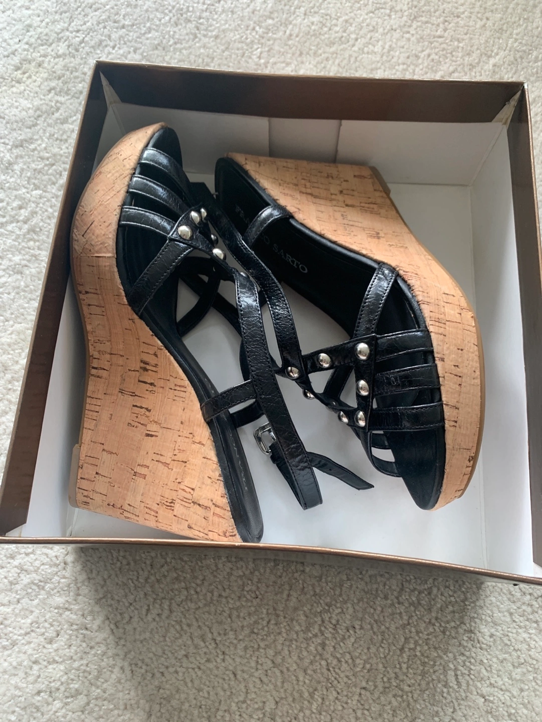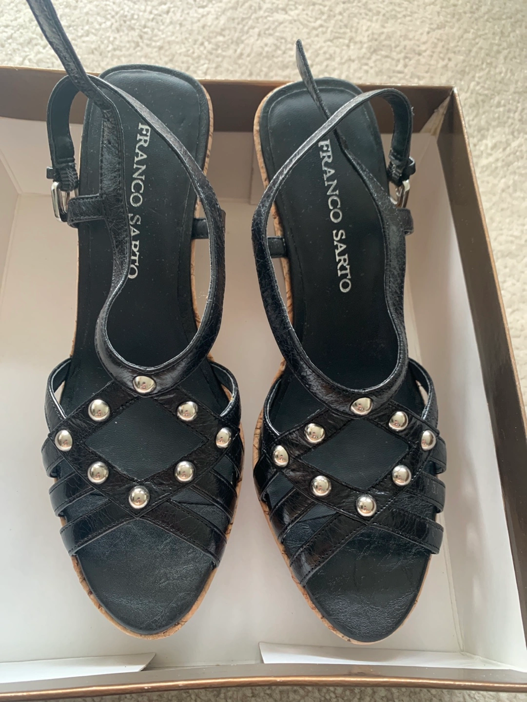 Black leather wedge sandals. Cork wedges. Silver-toned studs. Ankle strap closure. Never worn! Size 9.