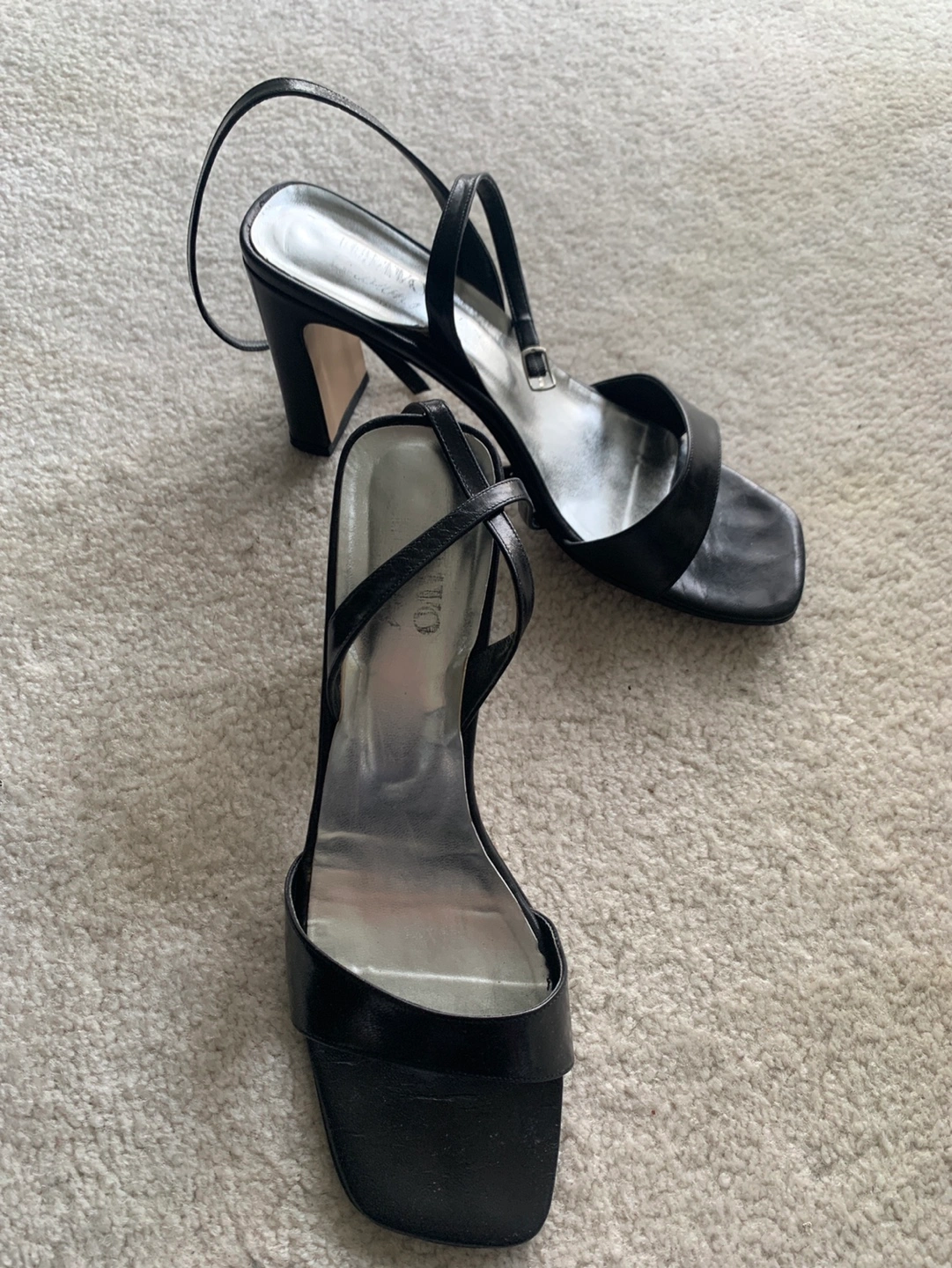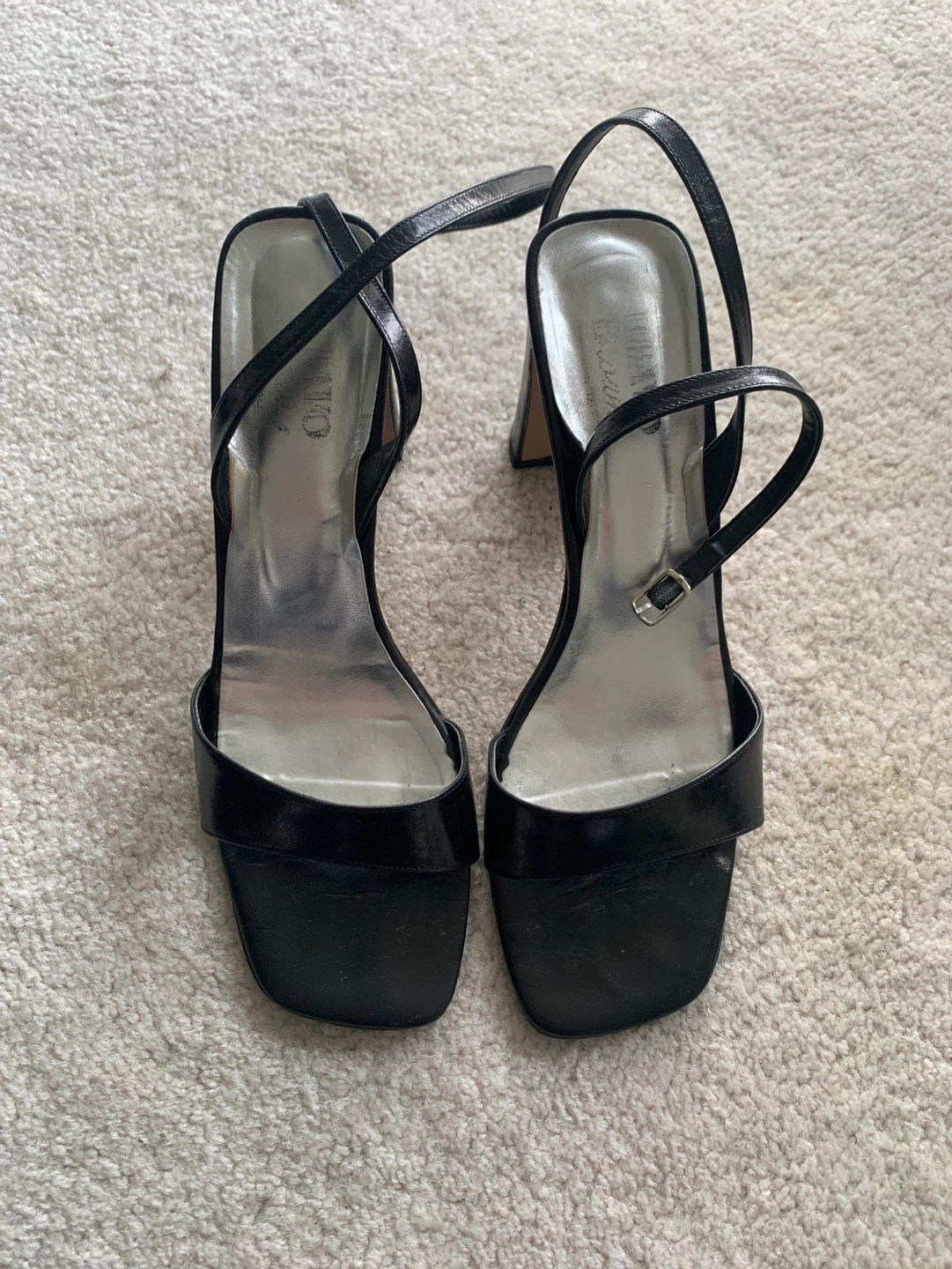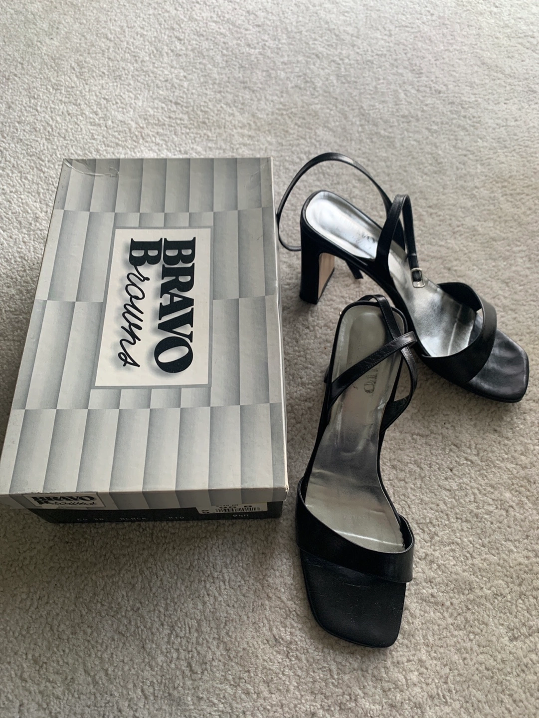 Elegant black leather sandals. Features ankle strap and block heel. Size 9. Comes in original box.
