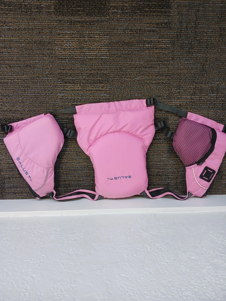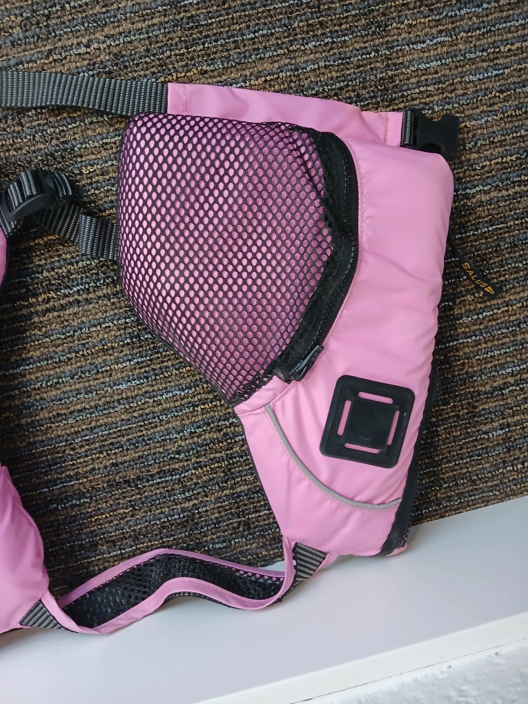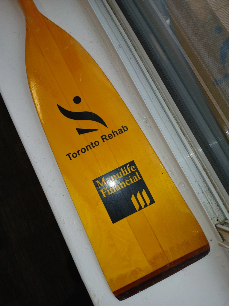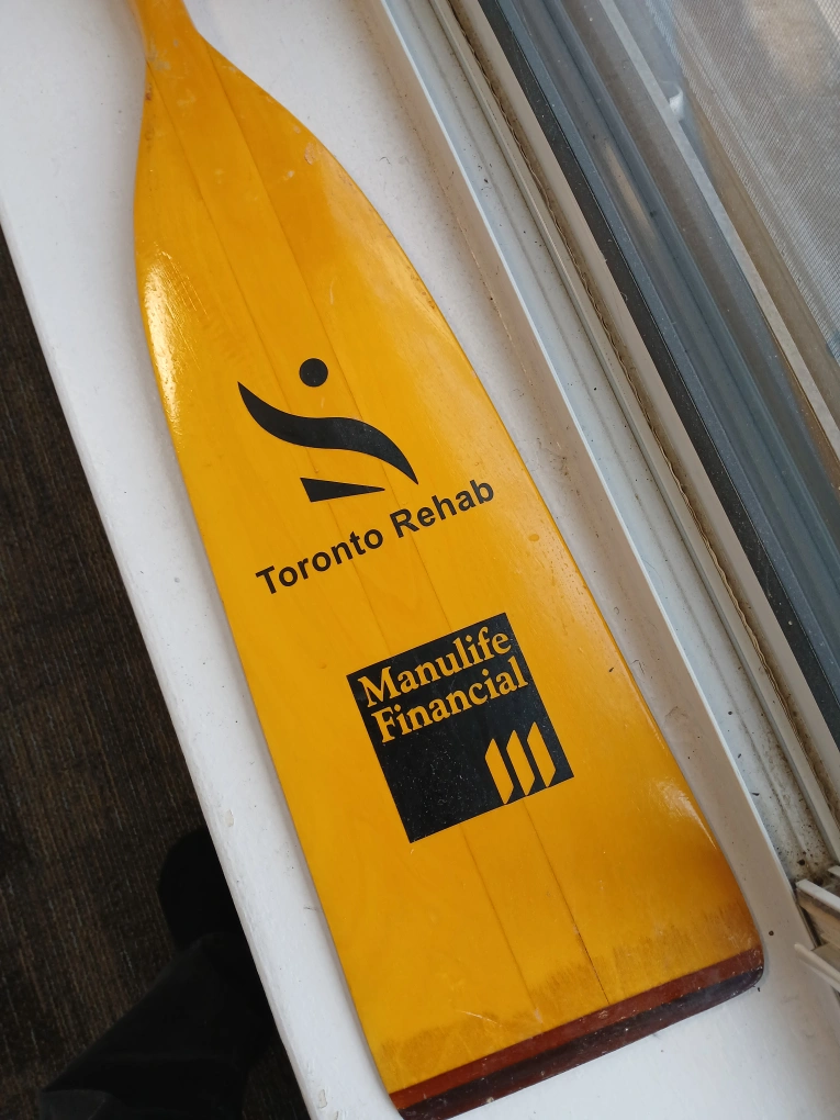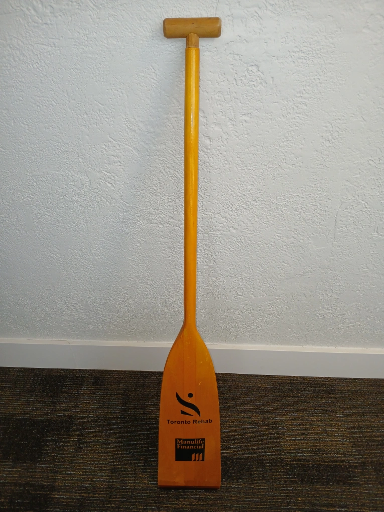 Unique wooden paddle. Features Toronto Rehab and Manulife Financial logos. Made by Upper Canada Paddle Company. Handmade in Canada. Great collectible or decorative piece. Plus a pink life jacket small/medium size.