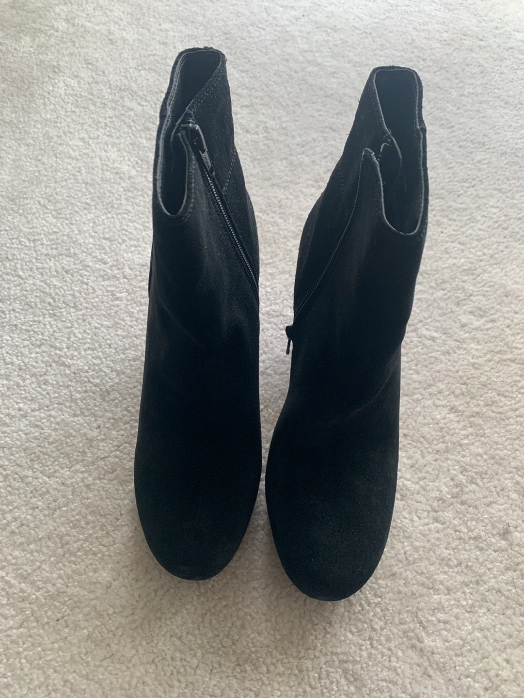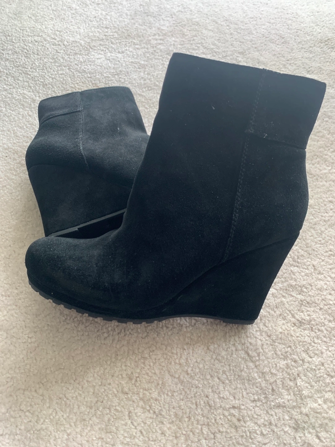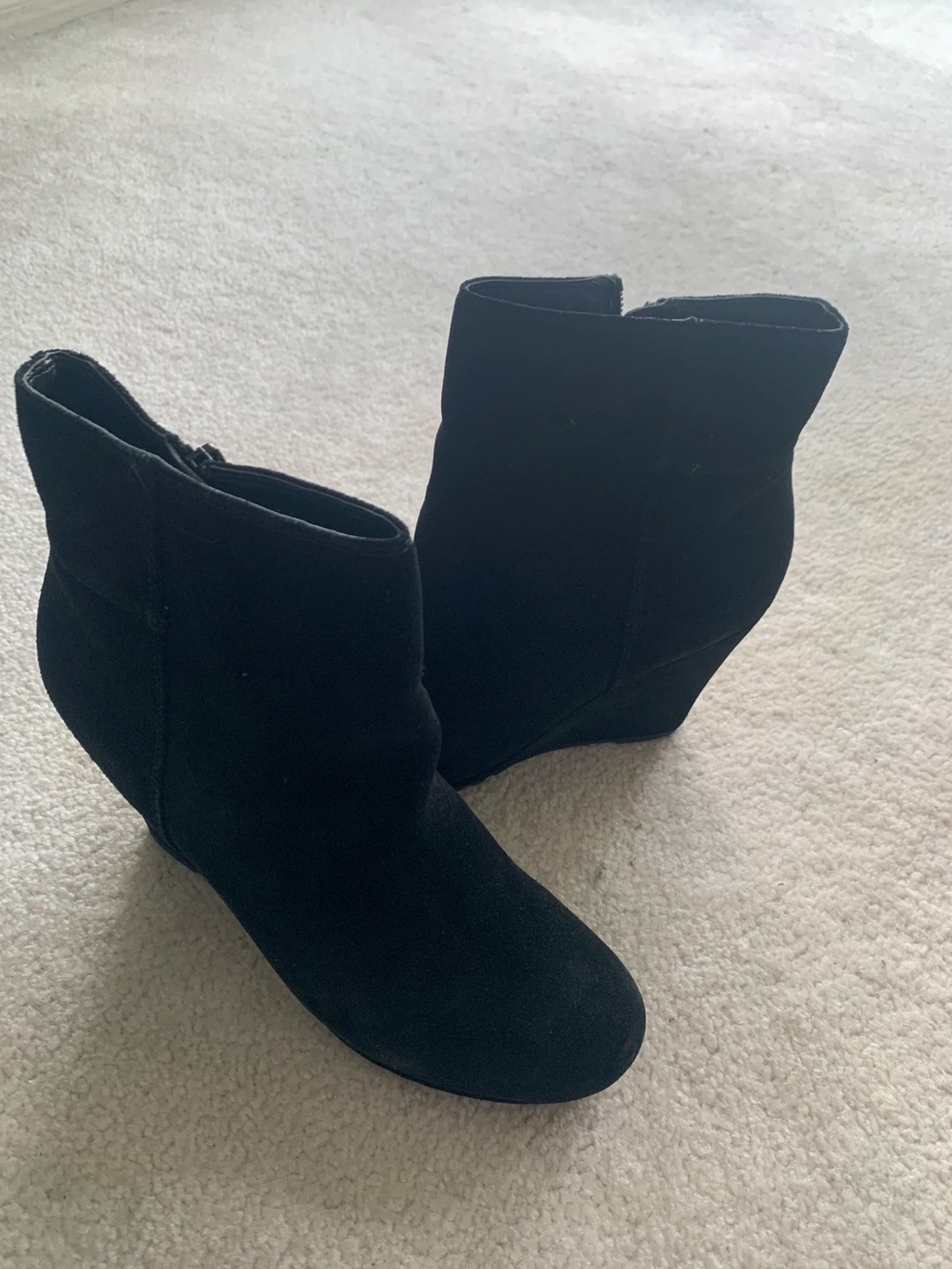 Women's black suede ankle boots. Wedge heel. Side zipper. Brand new, never worn. Comes in original box.