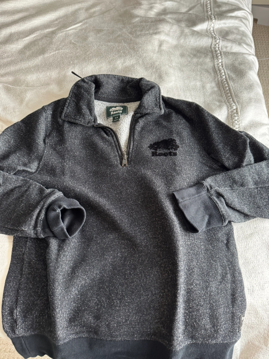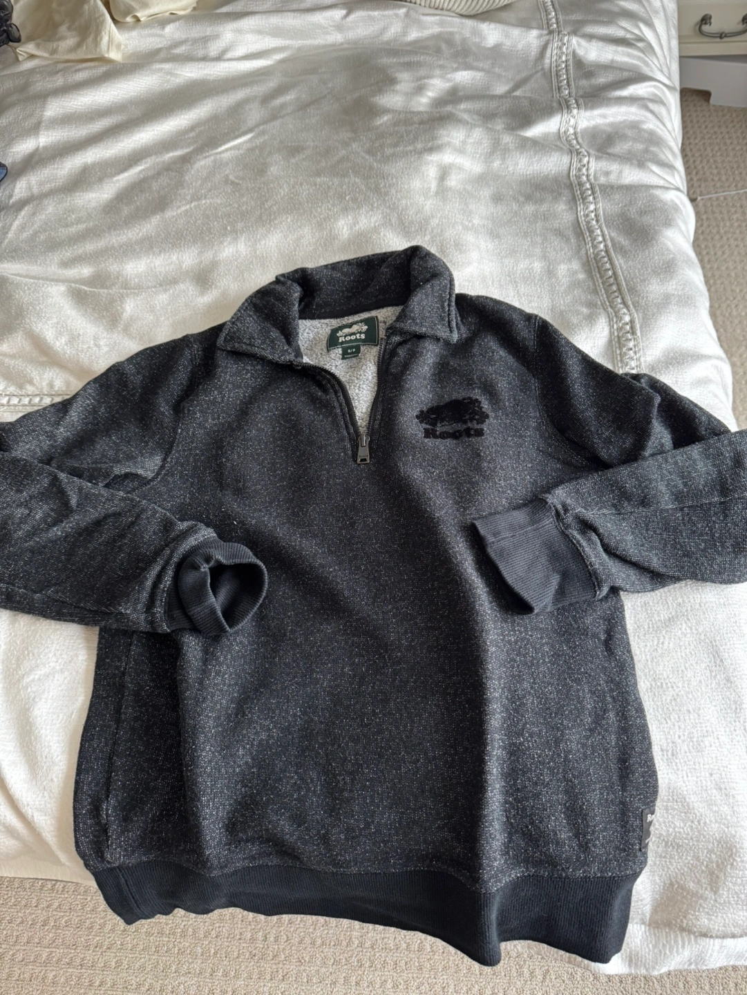 Women’s black Roots 1/4 zip pullover fleece. Features a small Roots logo on the chest. Soft and cozy.