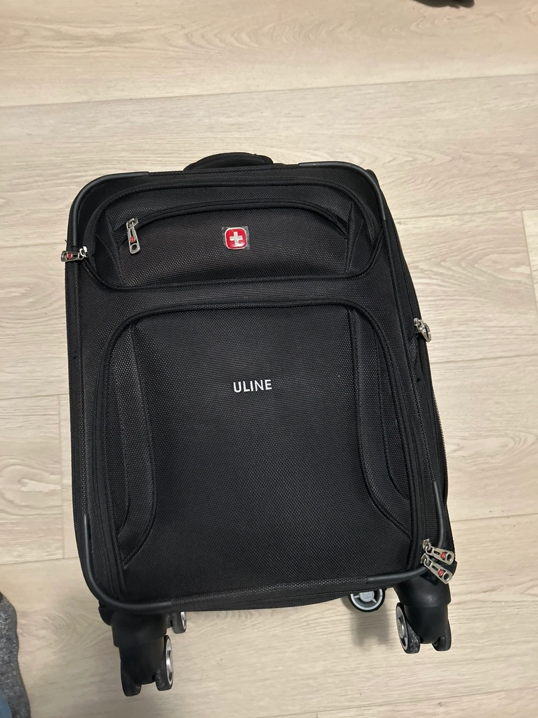 Black carry-on suitcase. Four wheels. Interior pockets and straps. Excellent for travel.